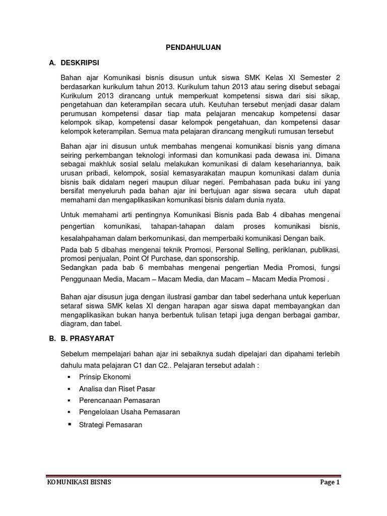 Resume - Komunikasi Bisnis, Djoko Purwanto (Edisi Ke Empat) Resume . Identitas Buku. Judul : Komunikasi Bisnis Edisi Empat. Pengarang : Drs. Djoko Purwanto MBA ... Menurut Bovee dan Thill dalam buku Business Communication Today yaitu: a. Pengirim mempunyai suatu ide atau gagasan. b. Buku Komunikasi Bisnis Edisi 5 yang hadir di tengah-tengah pembaca ini merupakan pengembangan dari edisi sebelumnyayang disesuaikan dengan perkembangan teknologi Internet yang kini dan nanti akan semakin semarak di tanah air. Karena itu, pembahasan yang berkaitan dengan proses penulisan pesan-pesan bisnis, surat-menyurat, penulisan tentang laporan, penulisan tentang pekerjaan, dan penulisan ... Bisnis perdagangan via internet saat ini sedang marak dilakukan. 4. Desa KASONGAN DI Bantul oenghasil kerajinan gerabah di antaranya, Soal UAS/PAS Prakarya Kelas 8 Semester 1 dan Kunci Jawaban . Buku Komunikasi Bisnis Djoko Purwanto Edisi 4; Download Buku Komunikasi Bisnis Djoko Purwanto Edisi 4