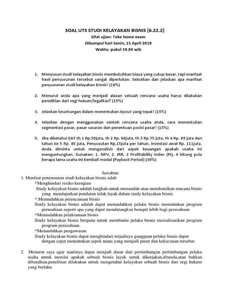Sebutkan 5 Contoh Analisis Kelayakan Finansial Brainlycoid. Bmp Ekma4311 Studi Kelayakan Bisnis. Contoh Soal Ujian Manajemen Sumber Daya Manusia Msdm. Studi Kelayakan Bisnis. Kumpulan Soal Uas Skb. Aspek Pasar Dalam Studi Kelayakan Bisnis Sarnoid. Begitulah informasi yang bisa kami uraikan mengenai contoh soal dan jawaban studi kelayakan bisnis.