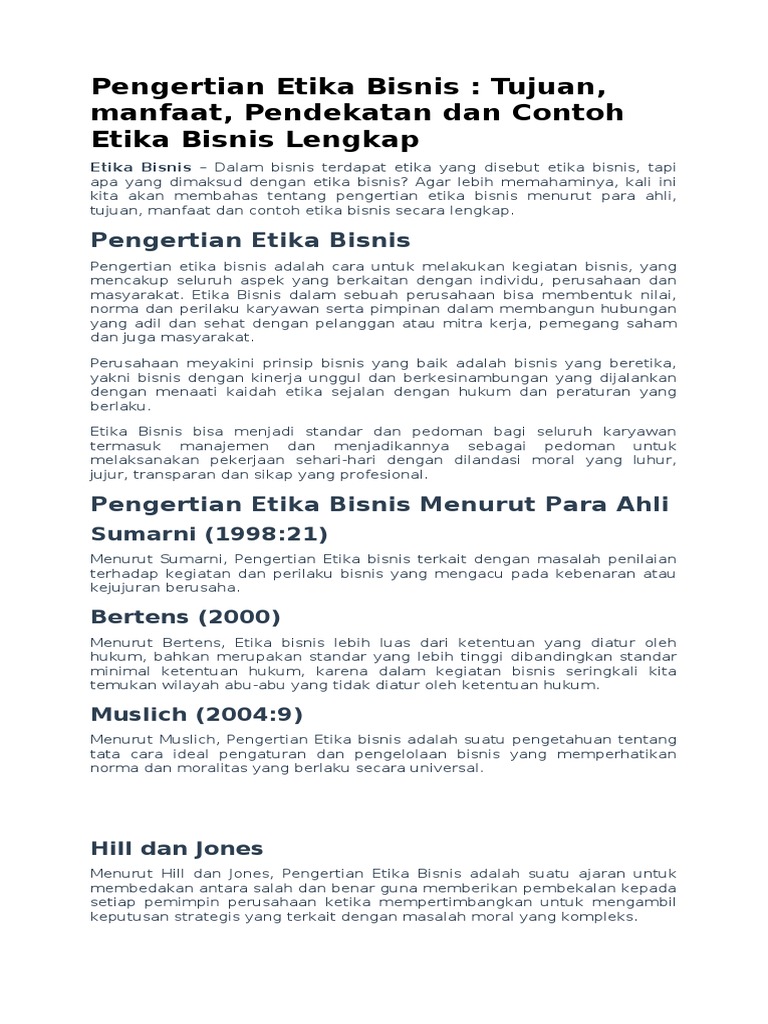 7.8. Sebarkan ini: Etika Bisnis Adalah -Pengertian, Makalah, Teori, Prinsip & Contoh - Banyak faktor yang mempengaruhi dan menentukan kegiatan berbisnis. Sebagai kegiatan sosial, bisnis dengan banyak cara terjalin dengan kompleksitas masyarakat modern. Dalam kegiatan berbisnis, mengejar keuntungan adalah hal yang wajar, asalkan dalam mencapai ... Pengertian Etika Bisnis. Etika Bisnis merupakan berbagai aturan yang tak tertulis soal bagaimana cara menjalankan suatu kegiatan bisnis dengan adil, serta sudah sesuai dengan hukum yang akan diberlakukan suatu negara dan tidak pula tergantung pada kedudukan individu maupun perusahaannya dalam bermasyarakat.. Etika bisnis dalam perusahaan yakni suatu bentuk etika terapan atau juga etika ... Pengertian Etika Bisnis, Contoh, Tujuan dan Alasan Pentingnya Etika dalam Berbisnis — Bukan hanya berperilaku dalam kehidupan sehari-hari, dalam melakukan bisnis pun kita harus tetap memperhatikan etika.Apalagi berbisnis merupakan salah satu usaha komersial untuk mendatangkan keuntungan yang pastinya kamu memerlukan membangun relasi dengan banyak orang.