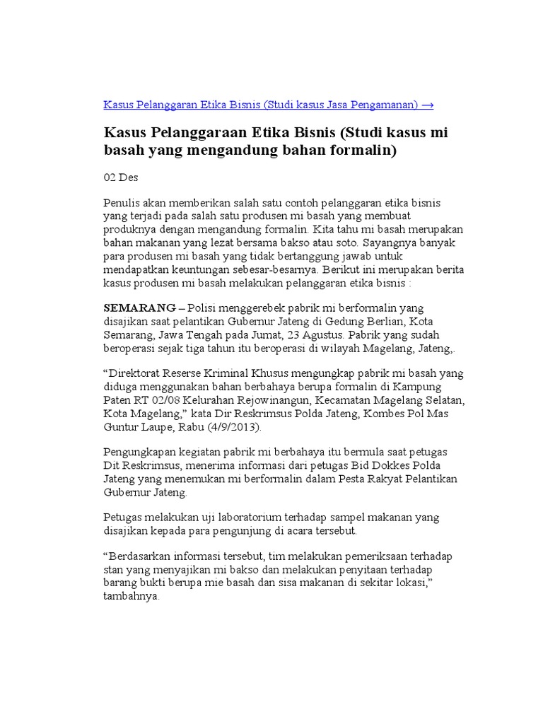 Jika Anda ingin mengetahui seperti apa kasus etika bisnis yang biasa terjadi, berikut adalah jawabannya menurut Fahmi (2013:9): Pelanggaran etika bisnis dilakukan oleh pihak-pihak yang mengerti etika bisnis. Dilakukan dengan sengaja karena faktor ingin mengejar keuntungan dan menghindari kewajiban-kewajiban yang selayaknya harus dipatuhi. Fungsi Kode Etik. Pada dasarnya kode etik memiliki fungsi ganda yaitu sebagai perlindungan dan pengembangan bagi profesi .fungsi seperti itu sama seperti apa yang dikemukakan Gibson dan Michel (1945-449)yang lebih mementingkan pada kode etik sebagai pedoman pelaksanaan tugas professional dan pedoman bagi masyarakat sebagai seorang professional. Pemahaman yang dimaksud di atas adalah sesuatu yang dianggap baik dan buruk. Apabila individu sudah dapat membedakan yang baik dengan yang buruk dan melakukan segala 'sesuatu' sesuai dengan norma atau aturan yang berlaku, etika akan menjadi suatu pedoman di mana individu itu mampu menerapkan 'sesuatu' tersebut. 3. Pengertian Analisis Bisnis. Secara sederhana, pengertian analisis bisnis adalah proses melakukan evaluasi apakah bisnis yang dijalankan memiliki berbagai risiko yang mungkin terjadi serta mengetahui sejauh mana kemungkinan prospeknya.. Pendapat lain mengatakan analisis bisnis adalah seperangkat tugas dan teknik yang digunakan sebagai penghubung antara para pemangku kepentingan untuk memahami ...