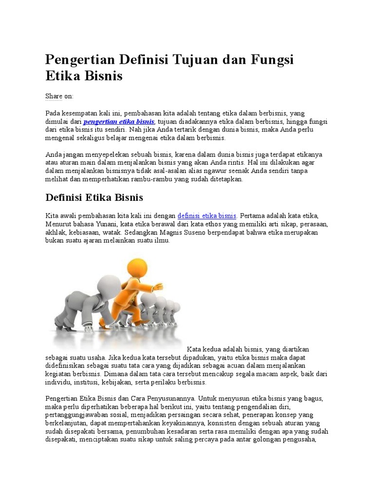 7.8. Sebarkan ini: Etika Bisnis Adalah -Pengertian, Makalah, Teori, Prinsip & Contoh - Banyak faktor yang mempengaruhi dan menentukan kegiatan berbisnis. Sebagai kegiatan sosial, bisnis dengan banyak cara terjalin dengan kompleksitas masyarakat modern. Dalam kegiatan berbisnis, mengejar keuntungan adalah hal yang wajar, asalkan dalam mencapai ...