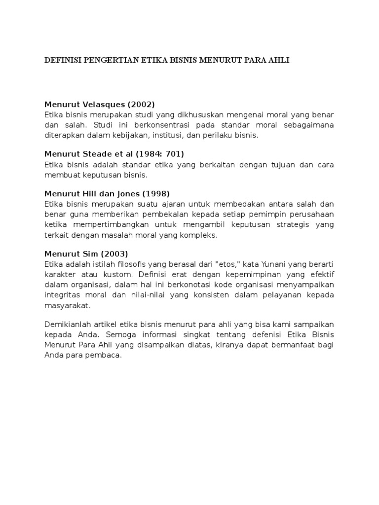 Apakah hakikat etika bisnis itu jelaskan. ... MAKALAH ETIKA BISNIS Diajukan untuk memenuhi salah satu tugas mata kuliah Etika Bisnis berupa makalah: ...