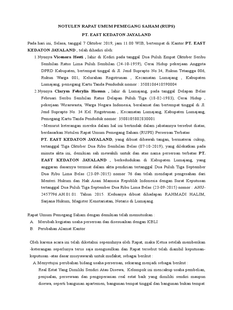 Contoh notulen rapat umum pemegang saham. Definisi Rapat Umum Pemegang Saham Luar Biasa (RUPS Luar Biasa) Selain sebagai organ perusahaan dengan kekuasaan dan kedaulatan tertinggi, RUPS juga merupakan suatu forum yang diselenggarakan secara rutin setiap tahun. RUPS tak hanya sebagai forum untuk menentukan kebijaksanaan umum perusahaan saja, tetapi juga wadah untuk menyampaikan laporan ... Sederhananya, dalam Rapat Umum Pemegang Saham dimungkinkan adanya komunikasi langsung/saling tukar ide antara peserta rapat (pemegang saham), nah dari pembicaraan hasil rapat itulah nanti dituliskan ke dalam suatu notulen Rapat, yang nantinya kita kenal dengan Notulen Rapat Umum Pemegang Saham. SEDAYA INDAH SELARAS sebagai pengganti Keputusan yang diambil pada Rapat Umum Pemegang Saham Luar Biasa yang ----- ditandatangani secara bersama-sama dan/atau dengan cara ----- diedarkan, yang terakhir ditandatangani pada tanggal tigapuluh satu Maret duaribu enambelas (31-03-2016) bermeterai cukup yang aslinya dilekatkan pada minuta akta ini ... Contoh Surat Undangan Rapat Umum Pemegang Saham Beserta Komponennya. Rapat umum pemegang saham atau RUPS menjadi momen penting bagi setiap perusahaan yang memiliki badan hukum berbentuk perseroan terbatas (PT). Apalagi, RUPS mempunyai kekuasaan tertinggi dalam lingkup perusahaan berbentuk PT. Mereka yang berhak berpartisipasi dalam RUPS adalah ...