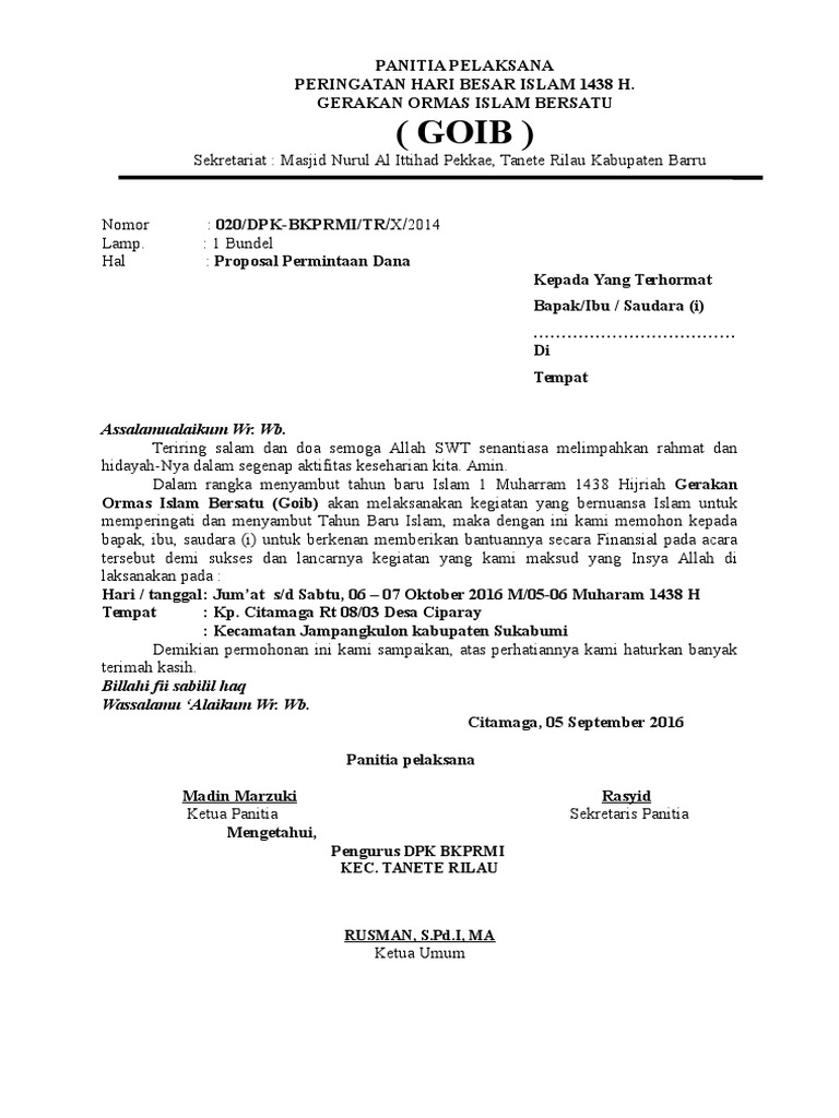 Contoh proposal bantuan dana kegiatan proposal merupakan suatu bentuk surat permohonan rencana kegiatan untuk mendapatkan sesuatu yang ditulis dalam bentuk rancangan kerja yang akan dilaksanakan dengan secepatnya. Misalnya, proposal untuk mendapatkan dana hibah penelitian tentu berbeda dengan proposal pengajuan dana masjid.