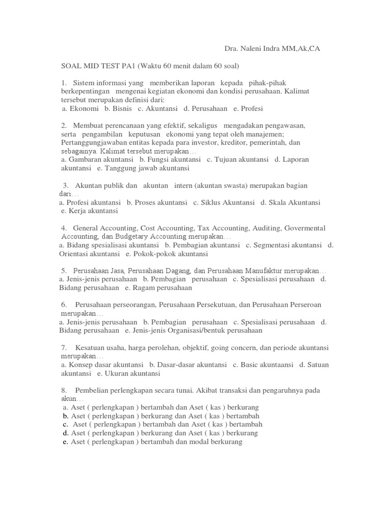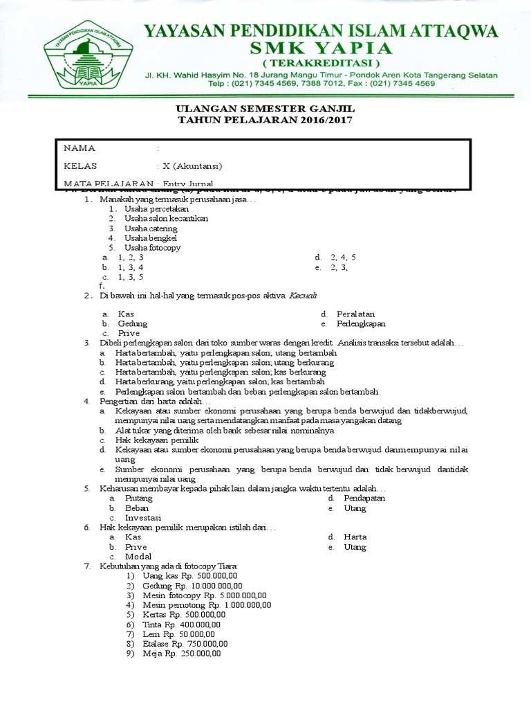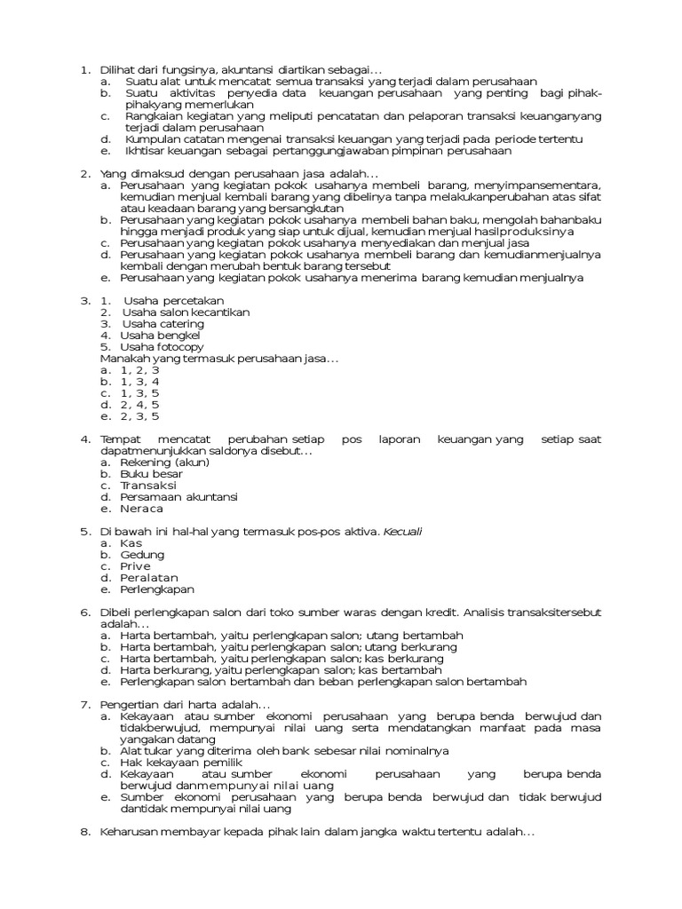 2. Yang dimaksud dengan perusahaan jasa adalah… 3. Di bawah ini hal-hal yang termasuk pos-pos aktiva. Kecuali. 4.Dibeli perlengkapan salon dari toko sumber waras dengan kredit. Analisis transaksitersebut adalah… 5. Pengertian dari harta adalah… 6. Keharusan membayar kepada pihak lain dalam jangka waktu tertentu adalah… 7.