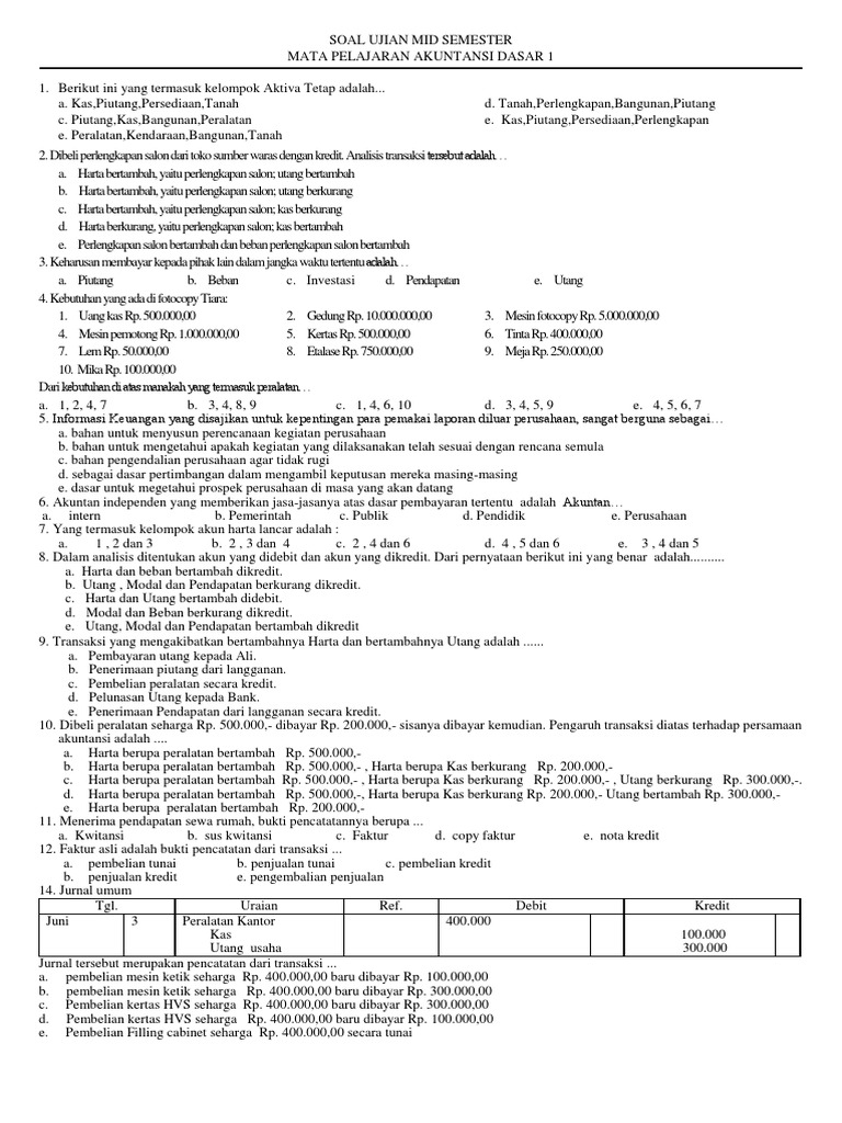 Dibeli Perlengkapan salon dari toko sumber waras dengan kredit. Analisis transaksi tersebut adalah harta bertambah, yaitu perlengkapan salon; utang bertambah. Baca juga: Salah satu hasil kebudayaan zaman perunggu adalah nekara. fungsi utama nekara adalah sebagai alat bunyi - bunyian dan dipergunakan untuk Perlengkapan Kunci : C 6. Dibeli perlengkapan salon dari toko sumber waras dengan kredit. Analisis transaksitersebut adalah… a. Harta bertambah, yaitu perlengkapan salon; utang bertambah b. Harta bertambah, yaitu perlengkapan salon; utang berkurang c. Harta bertambah, yaitu perlengkapan salon; kas berkurang d. Pemilik atau investor tersebut bebas menarik modal yang senilai dengan modal awal tersebut, tentunya keadaan ini dapat berimbas pada jalannya perusahaan. 4. Dibeli perlengkapan salon dari toko sumber waras dengan kredit. Analisis transaksi tersebut adalah… a. Harta bertambah, yaitu perlengkapan salon; utang bertambah. b. Dibeli perlengkapan salon dari toko sumber waras dengan kredit. Analisis transaksitersebut adalah… Harta bertambah, yaitu perlengkapan salon; utang bertambah Harta bertambah, yaitu perlengkapan salon; utang berkurang Harta bertambah, yaitu perlengkapan salon; kas berkurang Harta berkurang, yaitu perlengkapan salon; kas bertambah Perlengkapan ...