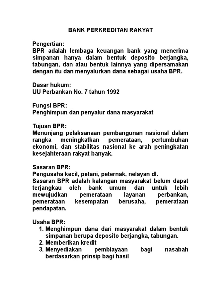 Pengertian bank perkreditan rakyat. Kegiatan operasional BPR dan BPRS (Bank Perkreditan Rakyat Dan Bank Pembiayaan Rakyat Syariah) seperti telah disinggung dalam uraian sejarah BPR (Baca Sejarah BPR), kegiatan operasional BPR di Indonesia diatur berdasarkan Undang-Undang No.7 tahun 1992 tentang Perbankan sebagaimana telah diubah dengan Undang-Undang No. 10 tahun 1998.. Dalam UU tersebut pengertian Bank Perkreditan Rakyat adalah ... Posting pada S1, SMK Ditag apakah yang dimaksud bank devisa, apakah yang dimaksud menyalurkan dana, bank syariah diatur dengan uu nomor, bank umum adalah, bentuk hukum bpr, berikut adalah termasuk kredit pasif, contoh bank perkreditan rakyat, daftar bank perkreditan rakyat, definisi bank umum syariah, jelaskan dan berikan contoh kredit aktif ... 2. Bank umum non devisa b) Bank Perkreditan Rakyat (BPR) 2) Berdasarkan Kepemilikan a) Bank persero b) Bank swasta nasional c) Bank pembangunan daerah d) Bank campuran e) Bank asing . 5. Prinsip Kegiatan Usaha Bank 1) Bank Konvensional 2) Bank Syariah . 6. Produk dan Layanan Bank 1) tabungan, 2) sertifikat deposito, 3) deposito berjangka 4) giro Bpr ( bank perkreditan rakyat). Pengertian dari bank umum sendiri adalah sebuah badan usaha perbankan yang menjalankan tugasnya secara konvensional serta berdasarkan prisip syariah yang ada. Seiring dengan peningkatan risiko, bank pun harus melakukan peningkatan modal. Dibawah ini adalah beberapa produk yang ditawarkan oleh bank umum, yaitu:
