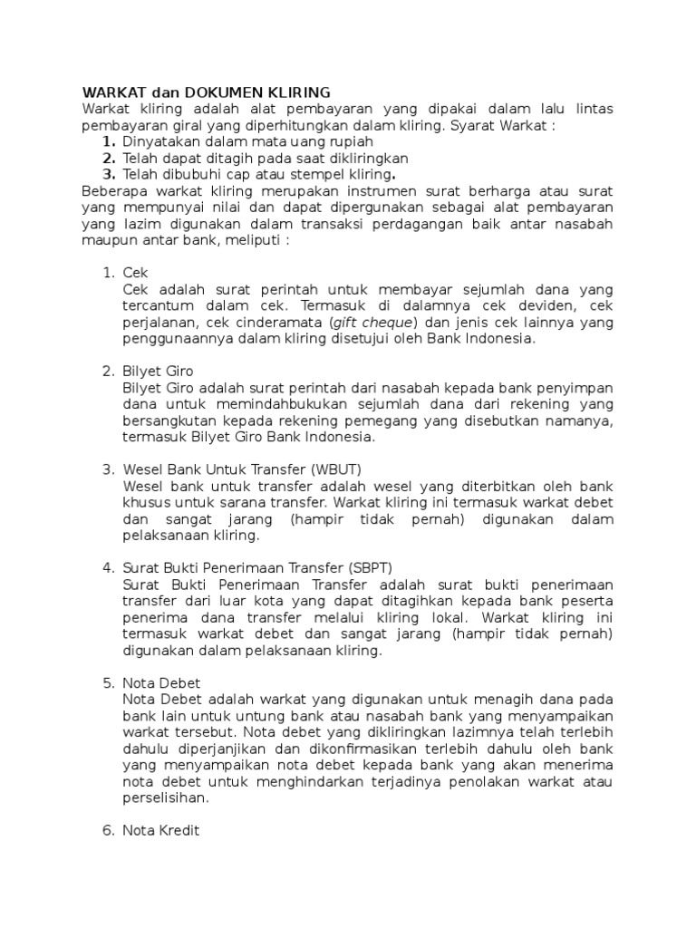 Bank wajib menetapkan satu kantor koordinasi di setiap wilayah kliring di mana bank tersebut menjadi peserta. Bank Indonesia tidak mengatur mekanisme internal bank dalam melakukan validasi cek dan BG luar kotanya. Dalam penyelenggaraan kliring, proses dan perhitungan ats cek dan BG luar kota tidak dipisahkan dari proses warkat lokal lainnya. Pengertian kliring menurut Pratnama Raharja (1997;132), yaitu : "Kliring adalah Perhitungan utang-piutang antara para peserta secara terpusat di satu tempat dengan cara saling menyerahkan surat-surat berharga dan surat-surat dagang yang telah ditetapkan untuk dapat diperhitungkan". Adapun pengertian kliring menurut Thomas suyatno (1999;81 ... Bank Indonesia Rp30.000. Jurnal Bank Mandiri(Warkat Kredit Masuk). Bank Indonesia Rp30.000. Giro(Kredit Nota) Rp30.000. Bank Indonesia. BMV jakarta Bank Mandiri ... Kliring Adalah Sarana Transfer Antarbank Skala Nasional. Sekar. . May 1, 2021May 1, 2021. Ajaib.co.id - Saat ini transaksi antar bank adalah hal yang lazim dilakukan khususnya melalui transfer online baik via internet banking maupun jaringan ATM. Padahal di masa lalu ketika internet belum menjadi hal yang lumrah, proses kliring adalah pilihan ...