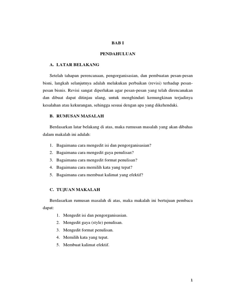 Kesalahan mekanik dalam penulisan pesan-pesan bisnis dapat mengganggu pemahaman maksud dan tujuan penulisan pesan-pesan bisnis. c. Mengedit format dan layout Jika format penulisannya menarik, ditata rapi, bersih, tidak penuh coretan, dan kertas yang digunakan berkualitas baik, audiens akan senang membacanya.