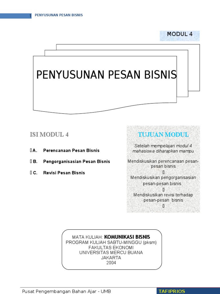 I. PROSES PENYUSUNAN PESAN Menyusun pesan bisnis yang menarik perhatian, mudah dibaca, dan mudah dipahami memerlukan kreativitas. Agar pesan bisnis efektif, diperlukan pemahaman terhadap proses penyusunan pesan bisnis. Proses penyusunan pesan bisnis umumnya terdiri atas tiga tahap sederhana, yaitu : Perencanaan Pesan Dalam tahap ini, ditentukan hal - hal yang mendasar dari suatu pesan yang…