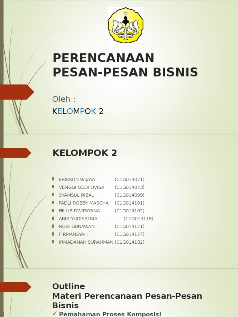 PERENCANAAN PESAN-PESAN BISNIS. Ø Perencanaan pesan bisnis adalah proses komposisi penyusunan pesan bisnis. Proses itu sendiri terdiri dari perencanaan tujuan, analisis audiens, penentuan ide pokok, dan pemilihan saluran atau media. 1.