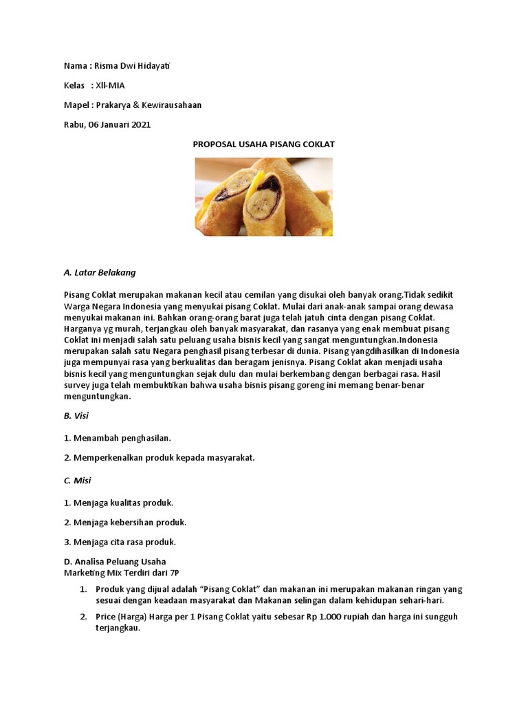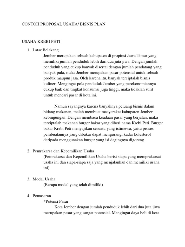 Contoh proposal bisnis makanan. Contoh Makalah Business Plan Pisang Karamel. Semut Belang Keuangan Bisnis, Makalah, Makanan, Pisang. Berikut adalah contoh makalah business plan atau proposal usaha tentang pisang karamel yang bisa kamu jadikan referensi lengkap mengerjakan tugas laporan. Jika tertarik, buka juga Makalah tentang Digital Marketing untuk contoh proposal usaha ... Contoh Proposal Usaha Makanan / Bisnis Plan Kuliner [Update 2020] Di tahun 2019, terhitung sangat banyak usaha makanan-makanan baru yang mulai menjamur, baik yang bersifat musiman maupun jangka panjang. Sebagai orang yang tentunya tidak ingin kehilangan kesempatan ini, tentu kamu kepingin juga kan punya bisnis makanan? Contoh Proposal Usaha Makanan - Usaha makanan adalah salah satu jenis usaha yang paling banyak diminati. Hal ini disebabkan usaha ini memang memiliki pasar yang besar. Semua orang pasti membutuhkan makanan baik itu makanan ringan, berat maupun minuman sehingga usaha makanan tak akan mengecewakan kamu. Banyak usaha makanan rumahan yang juga kian meningkat menjadi industri yang lebih besar sehingga membutuhkan contoh proposal usaha makanan sebagai acuan dari usaha yang akan dikembangkan. Bagi kamu para pemula tidak ada salahnya untuk mempelajari dan mendalami proposal usaha makanan, karena hal ini sangat bermanfaat untuk kepentingan bisnis ...