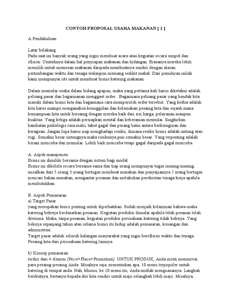 DOWNLOAD PDF. CONTOH PROPOSAL USAHA MAKANAN A. Pendahuluan Latar belakang Pada saat ini banyak orang yang ingin membuat acara atau kegiatan secara simpel dan efisien. Contohnya dalam hal penyiapan makanan dan hidangan. Dalam bisnis, proposal ada berbagai macam jenis dan dibedakan berdasarkan bidang usahanya. Dalam artikel edisi kali ini, Paper.id akan membagikan 3 contoh proposal usaha untuk usaha makanan, minuman dan usaha sepatu. Contoh proposal usaha makanan. Contoh proposal usaha yang pertama datang dari usaha jualan makanan ayam geprek tralala. No information is available for this page.Learn why Contoh proposal usaha makanan. 1. CONTOH PROPOSAL USAHA MAKANAN A.Pendahuluan Latar belakang Pada saat ini banyak orang yang ingin membuat acara atau kegiatan secara simpel dan efisien. Contohnya dalam hal penyiapan makanan dan hidangan. Biasanya mereka lebih memilih untuk memesan makanan daripada membuatnya sendiri dengan alasan pertimbangan ...