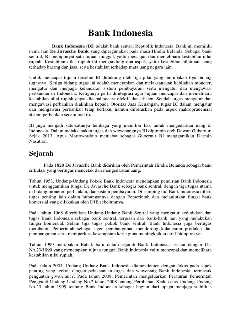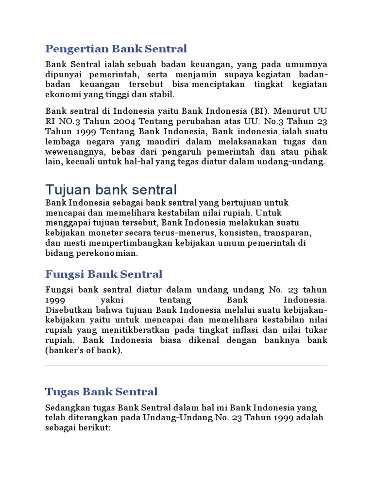 Sebagai wujud akuntabilitas dan transparansi bank sentral, Bank Indonesia ... Laporan ini memiliki dua fungsi utama, yaitu menyediakan data, analisis, ... Aug 02, 2021 · 1. Bank sentral. Bank sentral adalah institusi atau lembaga yang bertanggung jawab menjaga stabilitas harga dan nilai mata uang negara tersebut. Setiap negara pasti memiliki bank sentralnya masing-masing. Nah, kalau di Indonesia, bank sentral itu adalah Bank Indonesia.