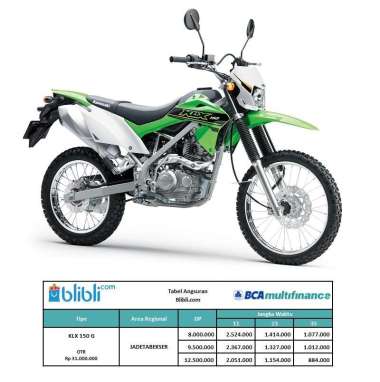 Harga Kawasaki KLX 150 Kredit/Angsuran. Masih tingginya harga Kawasaki KLX 150 2021 karena masih harus diimpor langsung secara utuh dari Jepang, maka pilihan kredit atau angsuran tentunya akan menjadi pilihan yang sangat tepat. Bagi Anda yang sudah dengan budget untuk membeli Kawasaki KLX 150 Angsuran kami akan menyajikan simulasi kredit ...