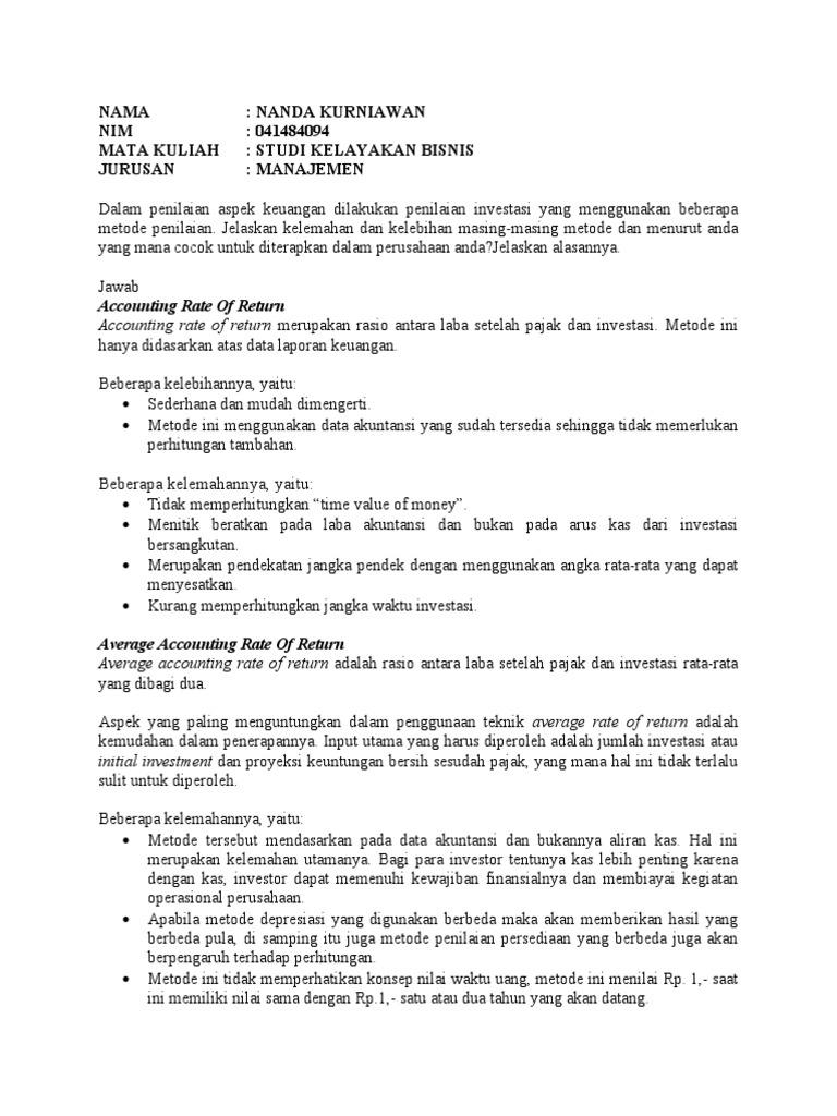 by A Abdurrohman · 2021 — studi kelayakan bisnis berdasarkan aspek keuangan, pengujian ini ... keuangan dalam pengujian ini menggunakan analisis NPV (net present value), IRR.2 pages
