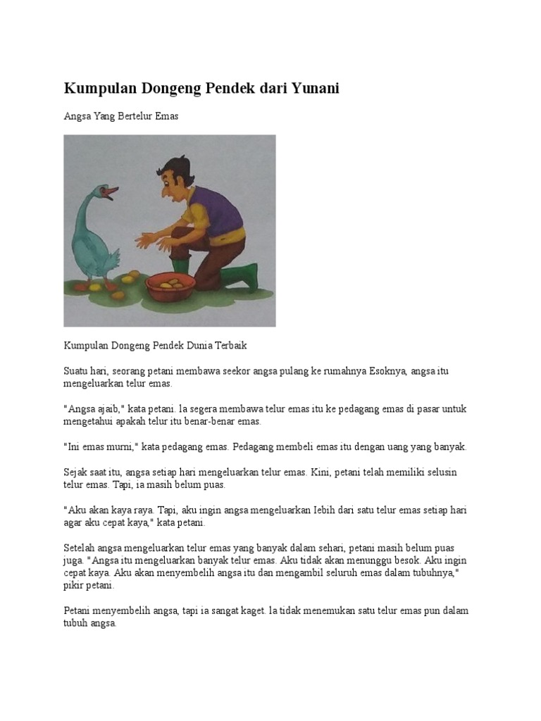 Cerita Dongeng - Angsa Dan Telur Emas. Pada zaman dahulu kala, ada seorang petani yang memiliki seekor angsa yang sangatlah cantik, dimana setiap hari ketika petani tersebut mendatangi kandang angsa, sang Angsa telah menelurkan sebuah telur emas yang berkilauan. 9. Telur Emas "Telur Emas" menjadi cerita rakyat yang bisa diceritakan kepada Si Kecil. Alkisah, ada seekor angsa yang dapat mengeluarkan sebutir telur emas setiap hari. Angsa itu dimiliki seorang petani dan istrinya. Mereka bisa hidup nyaman dan berkecukupan berkat telur tersebut. Kenyamanan ini berlangsung cukup lama. Dongeng Sebelum Tidur Petani dan Angsa Bertelur Emas | Jadwal Pelayanan Samsat Keliling Kabupaten Batang, Kamis 27 Agustus 2020 | 1.000 Hari Pertama jadi Penentu Tumbuh Kembang Anak | Kim Seon Ho Akui Aktor K di Skandal Aborsi Adalah Dirinya, Tulis Surat Permintaan Maaf | Terus Persiapkan Muktamar Ke-34 NU di Lampung, KH Said Aqil Siradj ... Posting pada SD, SMP Ditag amanat cerita angsa dan telur emas, apa menariknya hikayat, apa yang dimaksud amanat dalam dongeng, bagaimana cara perkembangan dongeng, cerita rakyat menurut para ahli, ciri ciri dongeng, ciri ciri dongeng mite bahasa sunda, contoh dongeng, contoh dongeng parabel, contoh fabel, contoh mitos dan legenda, dongeng ...