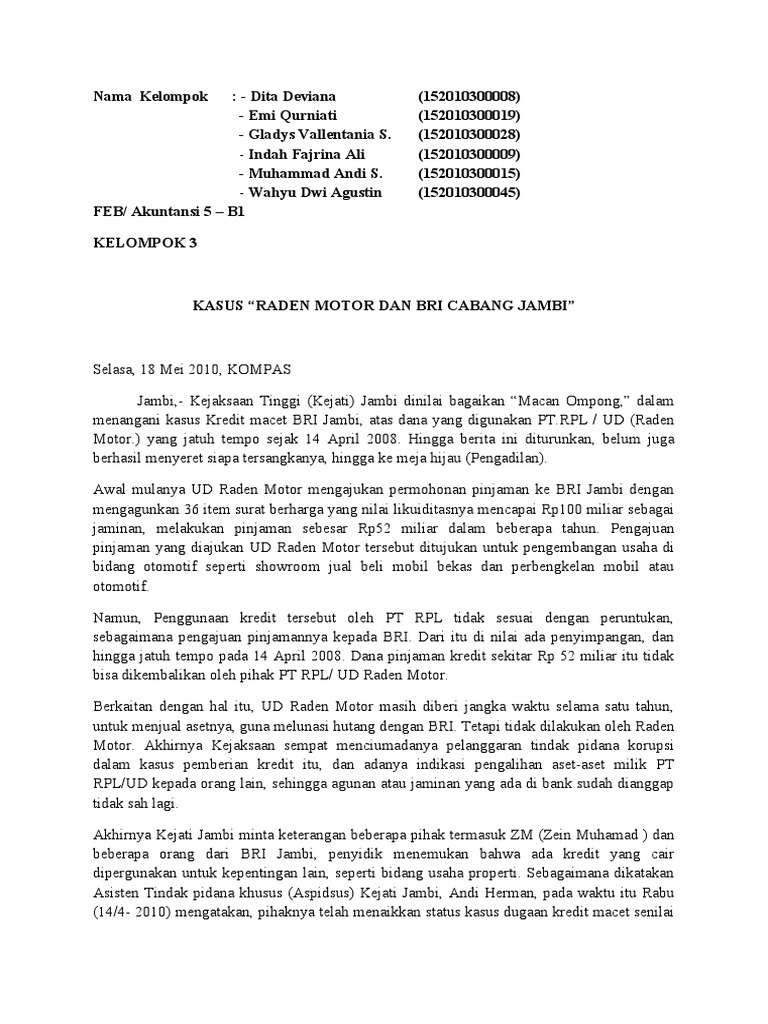 Tugas Kelompok 01 Law Kasus Kredit Macet Bri Jambi Docx Kasus Kredit Macet Bri Audit Internal Team Assignment 2101795153 Sari Satiagraha 2101795185 Course Hero