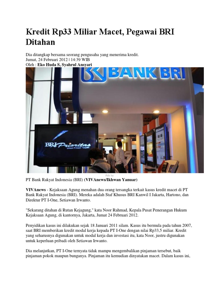 Kasus kredit macet bri cabang jambi 2010. KURNIAWAN, ADI (2012) ANALISIS PENANGANAN KREDIT MACET (Studi Kasus Pada Kredit Ritel BRI Cabang Lamongan). Other thesis, University of Muhammadiyah Malang. Lima kasus yang ditinjau adalah: 1) Bank Negara Indonesia (BNI) dan Grup Korindo; 2). Bank Central Asia (BCA) dan Grup Salim; 3) BRI dan Grup Sinar Mas;. CONTOH KASUS Kredit Macet Hingga Rp. 52 Miliar, Akuntan Publik Diduga Terlibat ... pegawai BRI Cabang Jambi yang terlibat kasus tersebut, Selasa [18/5/2010] ... 2006 2007 2010. Kasus Akuntansi Keuangan pada PT Kasus PT asian Agri Kasus Kredit Macet KAI Group BRI cabang Jambi. Kasus Pelanggaran Etika Profesi