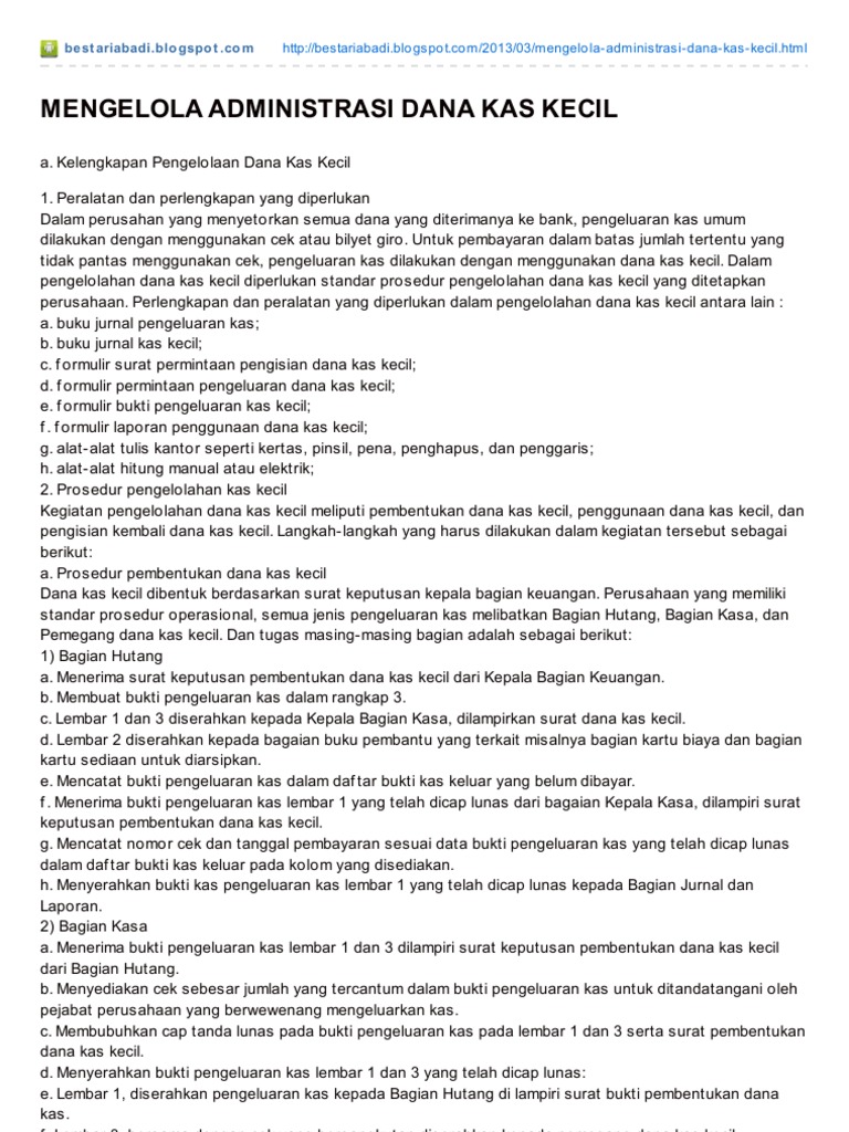 Q. Setiap penerimaan dan pengeluaran dana kas kecil , pemegang dana kas kecil harus mencatat ke dalam…. Q. Pengisian kembali dana kas kecil , bukti transaksi pemegang kas keci tergolong dalam bukti …. Q. Salah satu pekerjaan sekretaris adalah membuat laporan kas kecil , maka perangkat lunak yang biasa digunakan adalah …. 2. Kas kecil (Petty Cash) merupakan beberapa dana yang dibentuk terutama untuk pengeluaran yang bersifat rutin dan relatif kecil jumlahnya.Kas kecil dipakai untuk membiayai pengeluaran -pengeluaran pimpinan yang jumlahnya relatif kecil contohnya seperti dana entertain klien maupun rekan kerja pimpinan dan dana konsumsi untuk kepentingan rapat. SOAL PILIHAN GANDA DAN JAWABANNYA TENTANG DANA KAS KECIL Soal Pilihan ganda. 1.Aktiva di bawah ini yang tidak termasuk dalam kas adalah … . a.Cek mundur dari pelanggan. b.Uang dalam bentuk mata uang asing c.Cek dari pelanggan yang siap dicairkan d.Kas kecil e.Simpanan Giro di bank 2.Pernyataan berikut ini sesuai dengan dana kas kecil … . a.Digunakan untuk membayar jumlah yang relatif kecil ...