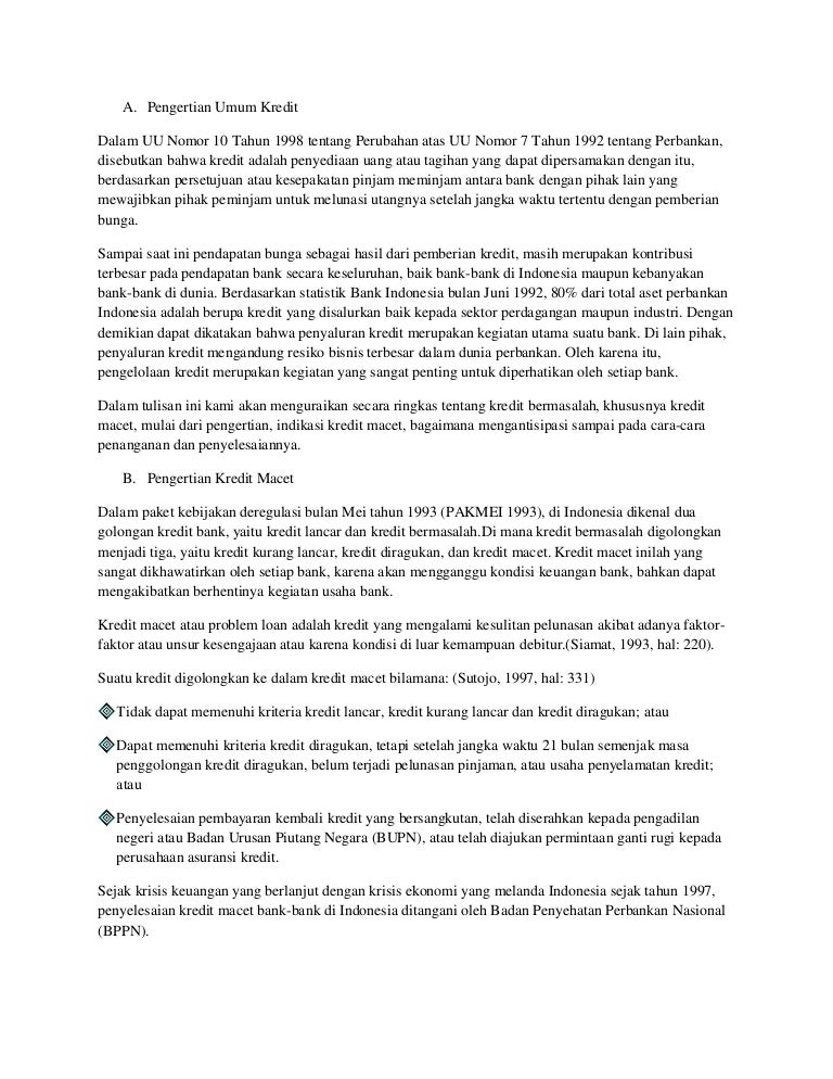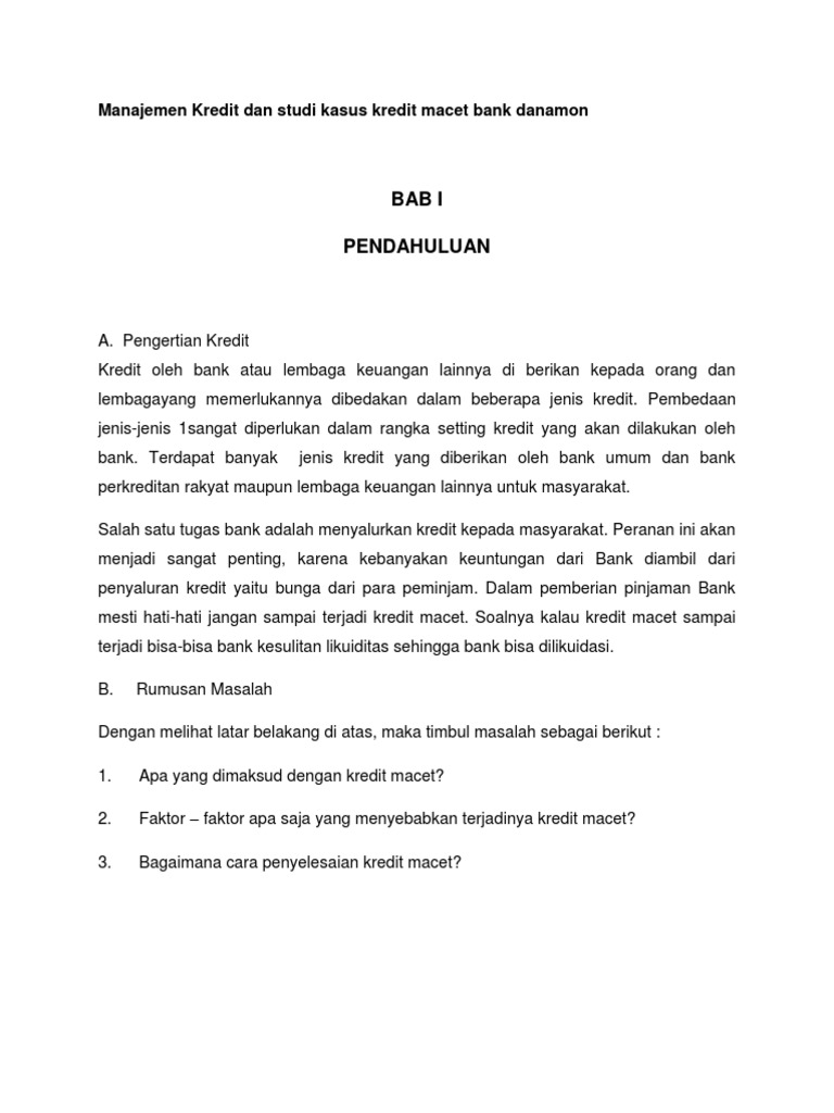 Desember 07, 2015. makalah cara penyelesaian kredit macet. BAB I. PENDAHULUAN. Sesuai dengan rumusan masalah dan tujuan penulisan maka yang menjadi batasan penulisan ini adalah "prosedur-prosedur penyelesaian kredit macet PT.
