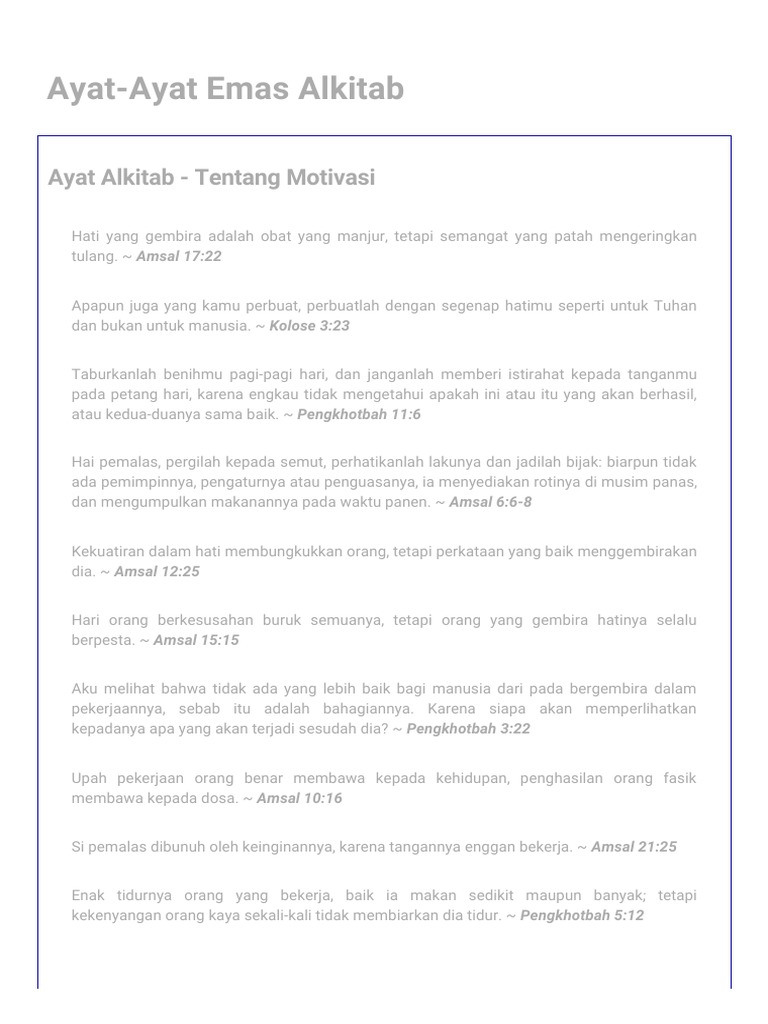 Ayat Emas Alkitab Indonesia Lengkap. Ayat - ayat Alkitab berisi firman dengan manfaat yang melimpah bagi mereka yang menyediakan waktu untuk membaca, merenungkan dan menerapkan kebenaran Firman Tuhan di dalam hidupnya. Dan menjadikan Tema kekuatan dalam Tuhan atau pada saat menghadapi persoalan dalam hidup.