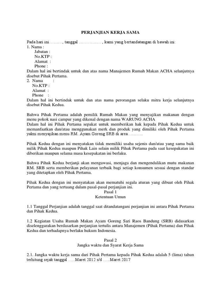 Contoh Surat Perjanjian Kontrak Bisnis Seringkali teman bertanya kepada saya, apakah ada contoh surat perjanjian kerjasama untuk pembuatan website. Dan saya rasa banyak diantaranya yang tidak segera belajar untuk menyimpan draft contoh surat perjanjian yang bisa di edit ulang dan digunakan kapanpun kembali. Apr 16, 2018 · Contoh Surat Perjanjian Kerjasama Bidang Bisnis. Bisnis pasti membutuhkan kerjasama antara beberapa pihak. Banyak kerjasama yang terjalin, tentu saja berpotensi mengembangkan bisnis pada skala yang lebih luas. Bentuk kerjasama yang terjalin tersebut tentu membutuhkan surat perjanjian hitam di atas putih.