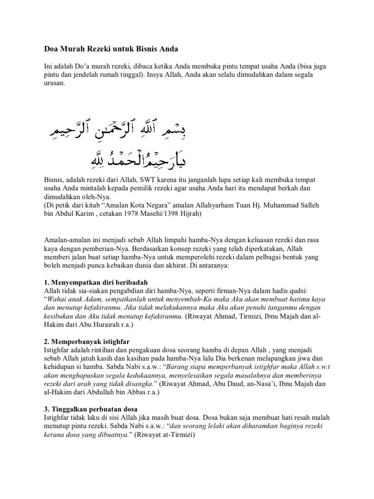 Doa pembuka pintu rezeki bagi Anda yang akan buka usaha. AKURAT.CO Umat Islam dianjurkan untuk selalu membaca dan mengamalkan doa-doa sebelum melakukan hal-hal positif. Tujuannya, agar Allah memberikan kemudahan dan kesuksesan apa yang sedang akan mereka jalani. Meskipun demikian, pada hakikatnya, doa itu sendiri adalah ibadah.