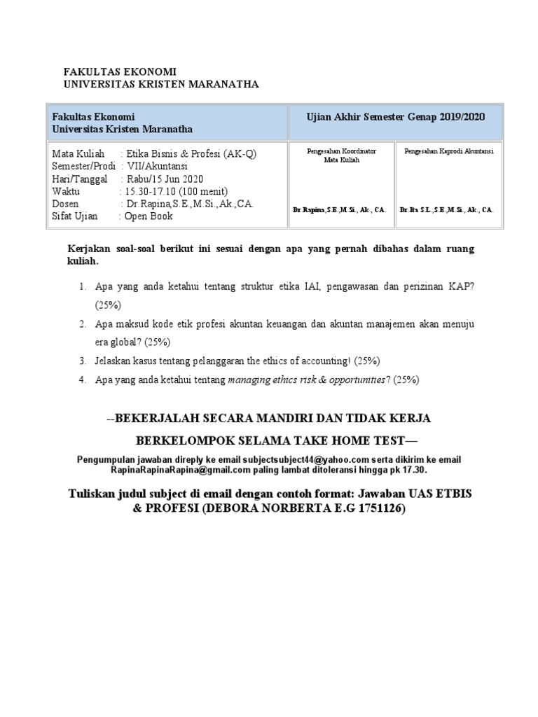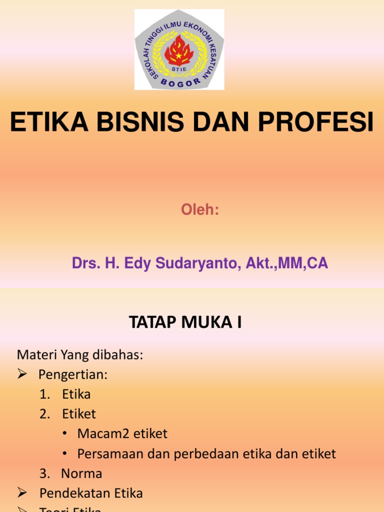 Mata Kuliah Etika Profesi adalah salah satu mata kuliah wajib pada Program Studi Administrasi Bisnis , Jurusan Administrasi Bisnis Politeknik Negeri Manado. Dalam proses pembejarannya, Mata Kuliah Etika Profesi ini belum memiliki materi pembelajaran yang dibakukan oleh institusi berdasarkan kurikulum yang berlaku. Bisnis yang baik bukan saja bisnis yang banyak mendatangkan keuntungan, tetapi juga bisnis yang baik secara moral. Tokoh etika Amerika Serikat, Richard T. De George (Ali dan Fauzi, 1998:21) Mengemukaan keberadaan etika dalam bisnis sebagai berikut: 1. Bisnis tidak bisa disamakan dengan permainan judi. Etika Profesi dalam Teknologi Informasi Pada masa sekarang ini yang di sebut-sebut dengan masa kebebasan demokrasi, kebebasan berpendapat dan kebebasan berkreasi banyak disalah artikan. Kebebasan yang dimaksud tetap harus mengikuti tata tertib yang berlaku , UU yang berlaku dan tetap pada jalur yang benar. Tahun Akademik: Gasal 2021/2022 Kelas-Offr: Q-Q Deskripsi: Mata Kuliah Etika Bisnis dan Profesi ini memberikan suatu kerangka komprehensif dan pemahaman tentang etika dalam tata interaksi di tempat kerja dengan cakupan pembahasan meliputi: pengertian etika dan moral, etika profesi secara umum, etika dalam dunia bisnis , ukuran sikap dan tindakan (norma) yang baik dan buruk, budaya perusahaan ...