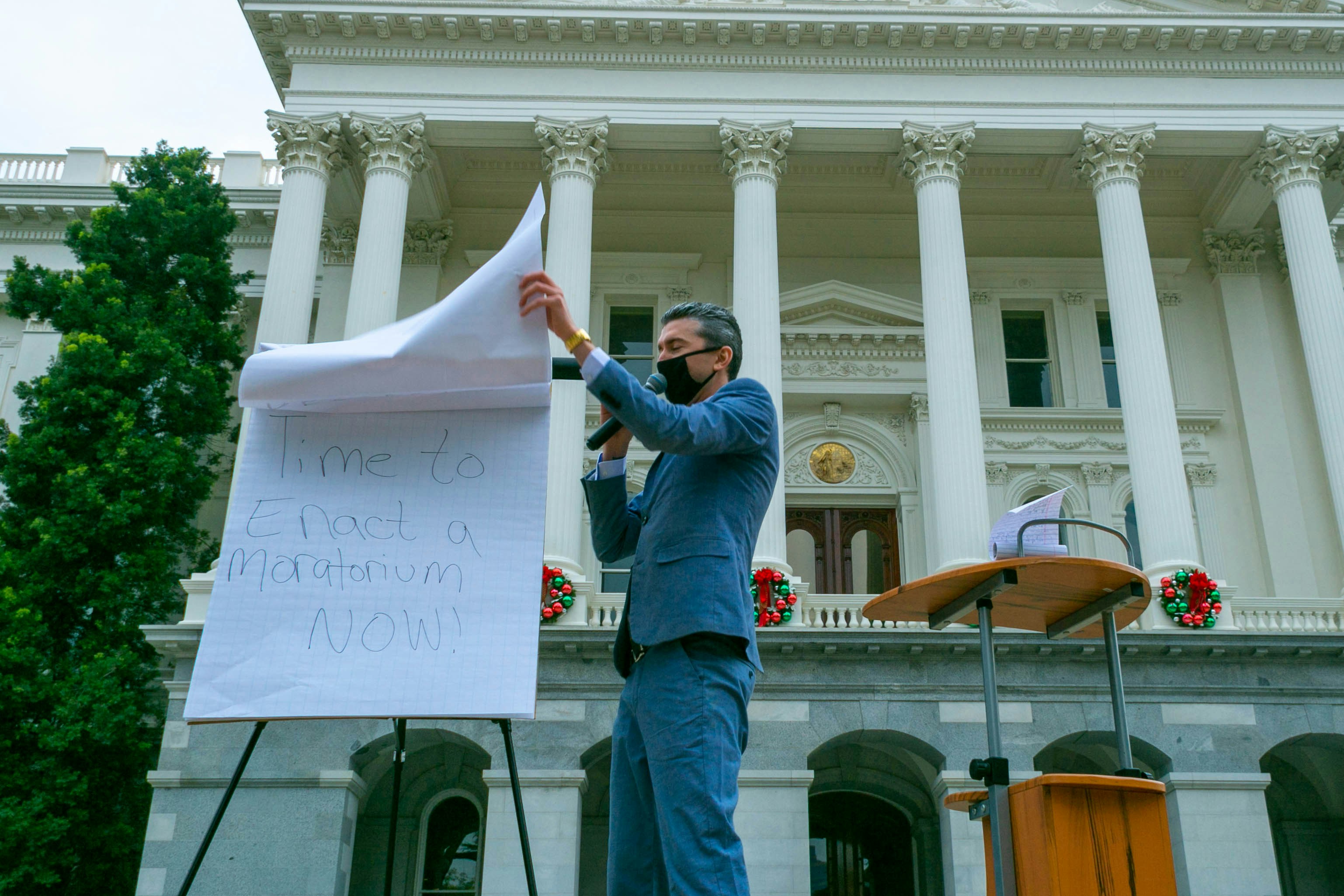 Gavin Newsom declares moratorium, banning the construction of new factory farms or slaughterhouses in California. Learn more at NoMoreFactoryFarms.com