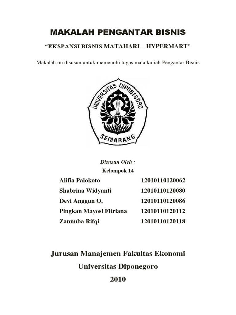 Contoh Makalah Pengantar Bisnis. MAKALAH. Disusun oleh: Nama Anda. TAHUN 2014 ... pengertian,hubungan, dan bentuk usaha kecil dan kewirausahaan.