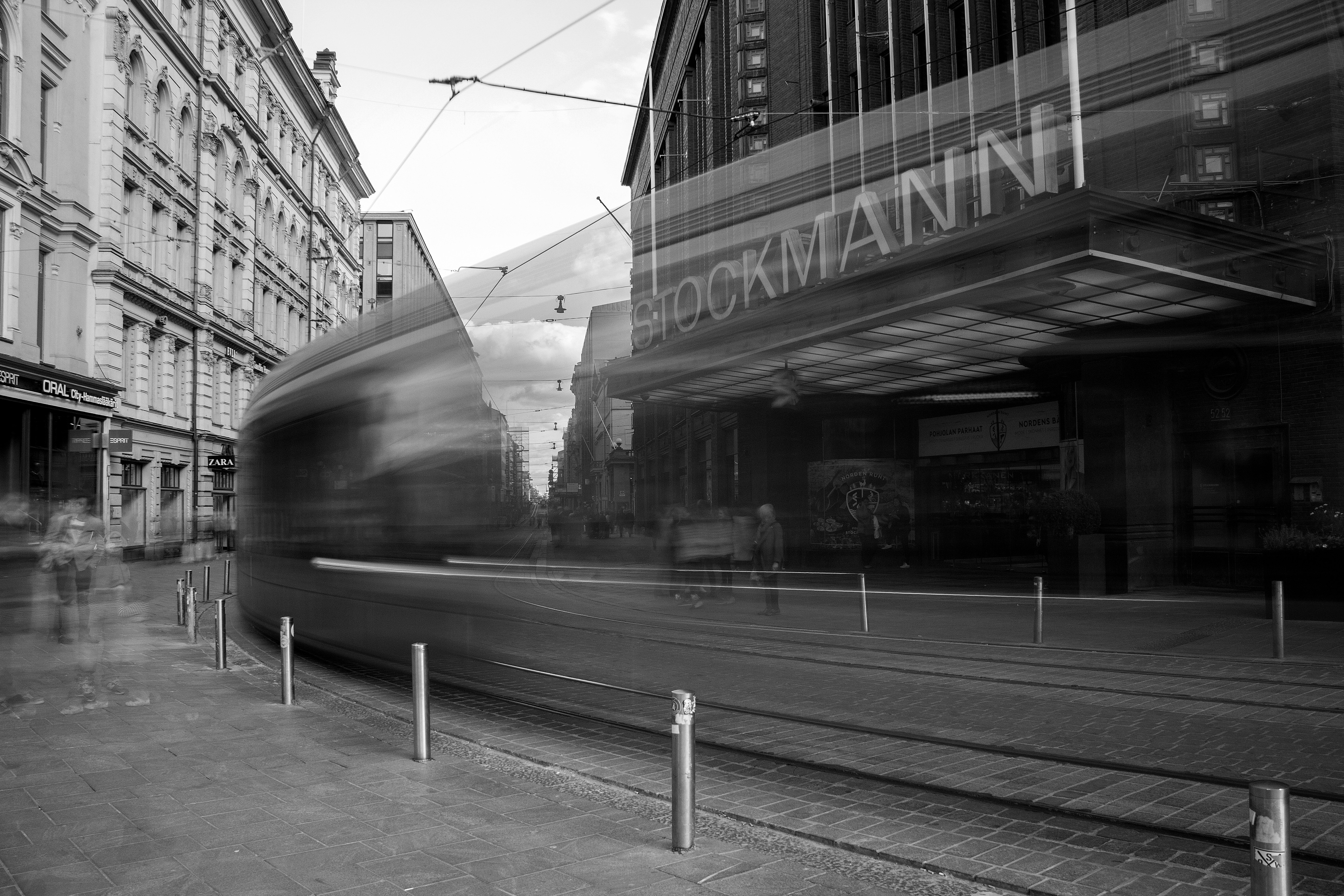 An ordinary day in the center of Helsinki. The Stockmann department store is a landmark in Helsinki, built in 1930 as an eight storey shopping center. Nowadays itâs the largest department store in Northern Europe, with shop-in-shop retailers. The actual focus in this picture though is the tram passing the main entrance. The newly introduced modern tram in Helsinki makes an exciting contrast to the old ones, bypassing the old landmark visited by millions of locals and tourists.