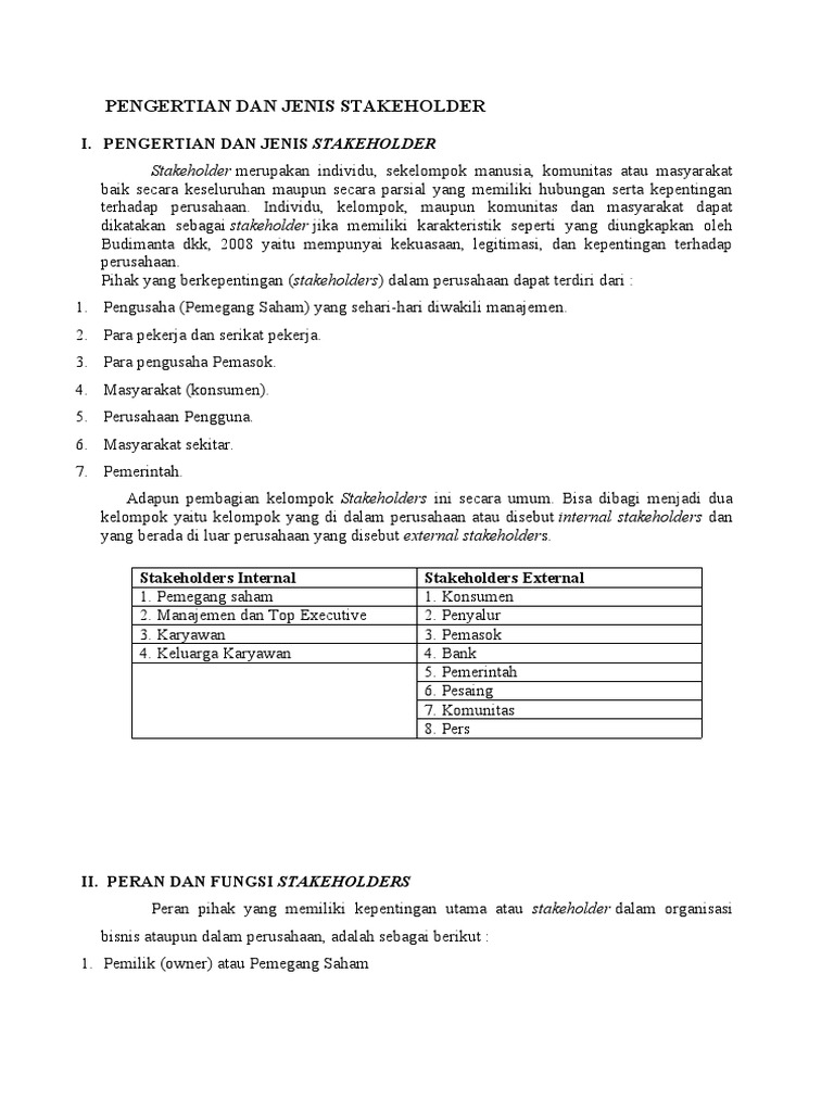 Pengertian Stakeholders. Pada saat ini istilah atau kata stakeholder sudah mulai banyak didengar oleh banyak orang, istilah stakeholder banyak di gunakan oleh banyak pihak karena bersangkutan dengan berbagai macam ilmu, contoh ilmu bisni, komunikasi dan informasi serta pengolahan sumber daya dan lain".