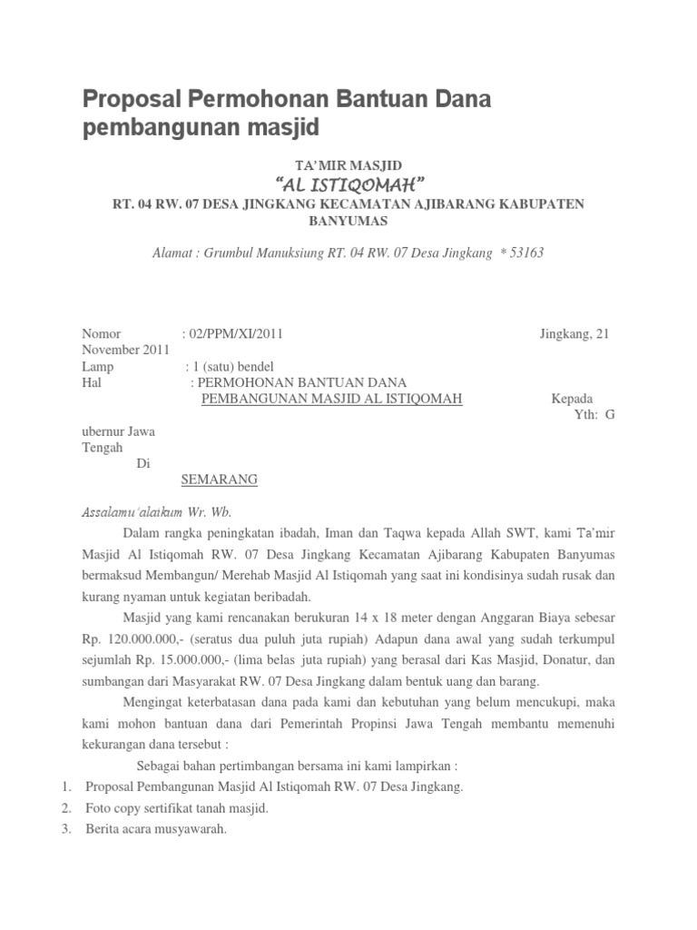 Contoh Surat Permohonan Bantuan Dana Pembangunan Masjid Doc Document. Proposal permohonan bantuan pembangunan masjid babussalam disusun oleh: panitia pembangunan masjid babussalam dukuh sikucing desa banyumudal kecamatan moga kabupaten pemalang jawa tengah panitia pembangunan masjid babussalam akta notaris no. 62 tanggal 3 maret 2016 dukuh sikucing desa banyumudal kecamatan moga kab.