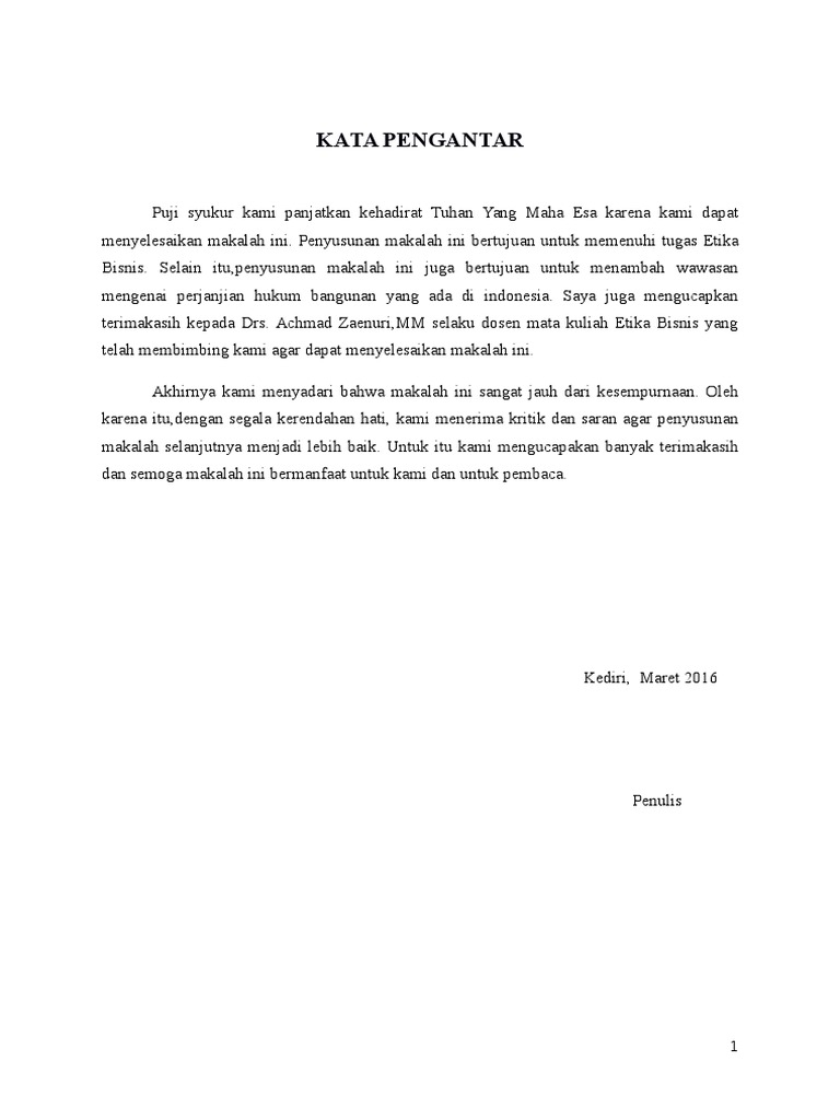 Kata pengantar makalah etika bisnis. Sesuai dengan pembukaan atau kata pengantar yang ada pada beberapa paragraf di atas, contoh karya tulis kali ini akan membahas seputar makalah tentang ekonomi bisnis dengan tema seperti yang telah disetujui di atas. Dalam uraian ini akan dibahas tuntas mengenai contoh dan juga tips menyusun makalah agar cepat selesai dan lebih mudah. Makalah Pengantar Bisnis "Corporate Social Responsibility" Disusun oleh : Alliyah Bening Safitri (20215561) 1EB02 Dosen : Titi Ayem Lestari, SE, MM Mata Kuliah : Pengantar Bisnis Fakultas Ekonomi / Akuntansi Universitas Gunadarma Depok 2015 KATA PENGANTAR Puji syukur saya panjatkan kehadirat Tuhan Yang Maha Esa karena dengan rahmat, karunia, serta taufik… MAKALAH " ETIKA KOMUNIKASI DALAM BISNIS SERTA CONTOH KASUS " MAKALAH ... KATA PENGANTAR ... Masalah etika bisnis atau etika usaha akhir-akhir ini semakin banyak dibicarakan bukan hanya di tanah air kita, tetapi juga di negara-negara lain termasuk di negara-negara maju. Perhatian mengenai masalah ini tidak terlepas dari semakin berkembangnya ... KATA PENGANTAR. Puji syukur kami panjatkan kepada Tuhan Yang Maha Esa karena atas berkat dan rahmatnya kami dapat menyelesaikan makalah Etika Profesi IT chapter 2 dengan judul "Audit". Adapun makalah ini kami buat untuk memenuhi tugas pengganti nilai UAS untuk mata kuliah Etika Profesi IT.