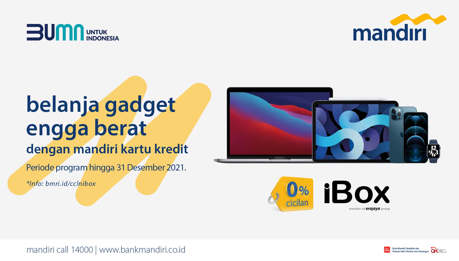 Cicilan 0% hingga 24 bulan - Mandiri Kartu Kredit Nikmati kemudahan bertransaksi dalam pembelian Gadget lebih ringan dengan cicilan 0% hingga 24 bulan di merchant- merchant pilihan.Dapatkan gadget impianmu sekarang transaksimu bisa lebih mudah dengan fitur cicilan dari Mandiri Kartu Kredit.Kamu bisa bayar transaksi mu dengan cicilan bunga 0% hingga 24 bulan di iBox.