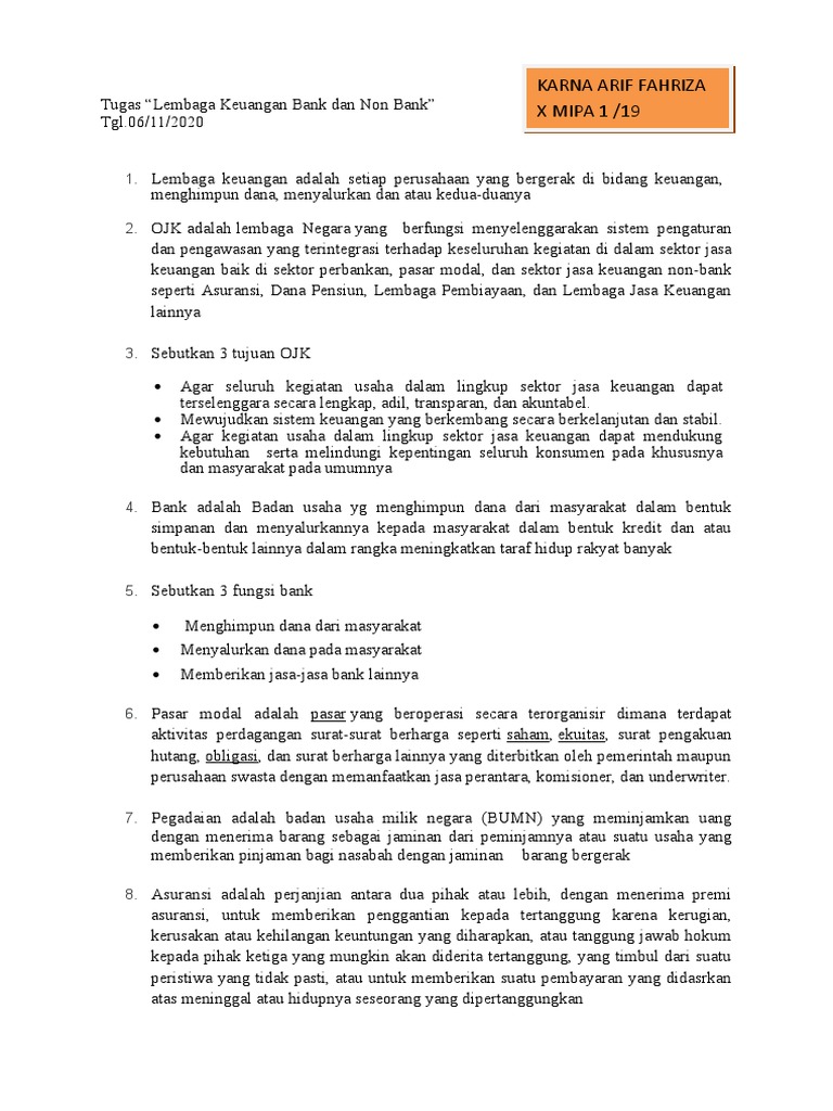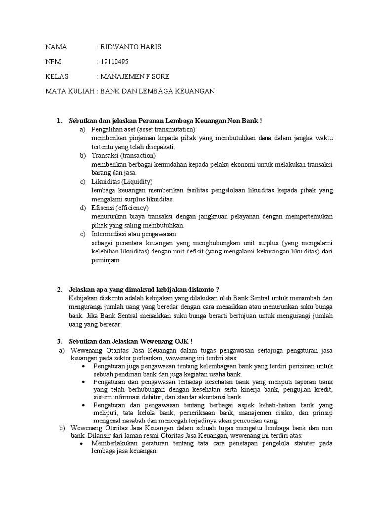 Tuliskan wewenang ojk dalam melaksanakan tugas pengawasan lembaga jasa keuangan bank dan non bank. Perihal Hak Asasi Manusia di Google Hak Asasi Manusia Dalam surat pertama mereka kepada pemegang saham, pengasas kami menyerlahkan matlamat Google iaitu untuk “membangunkan perkhidmatan yang nyata sekali dapat menambah baik kehidupan pengguna seramai yang mungkin”. Visi ini sentiasa menjadi panduan kami semua di Google. Kami percaya akan pengaruh dan potensi teknologi untuk memberikan kesan yang benar-benar positif di seluruh dunia. Dalam apa-apa jua yang kami lakukan, termasuklah melancarkan pr... 15.10.2020 ... Baik di sektor perbankan, pasar modal, dan sektor jasa keuangan non-bank seperti asuransi, dana pensiun, lembaga pembiayaan, maupun lembaga jasa ... 19.11.2020 ... Wewenang Otoritas Jasa Keuangan dalam tugas pengawasan lembaga bank dan non-bank. Wewenang ini terdiri atas: Menetapkan kebijakan operasional ... Liga Komunis Internasional (Internasionalis Keempat) merupakan suatu aliran yang bersifat internasionalis, proletar dan revolusioner. Aliran ini bertekad membangun partai-partai Leninis sebagai seksi-seksi nasional dari organisasi internasional yang demokratik-sentralis. Tujuan organisasi adalah untuk memimpin kelas buruh memperoleh kemenangan melalui revolusi sosialis di seluruh dunia. Hanyalah kaum proletar, melalui perebutan kekuasaan politik dan penghancuran kapitalisme sebagai suatu sistem...