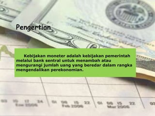 Kebijakan bank yang berhubungan dengan perubahan tingkat suku bunga disebut politik apa? Kebijakan moneter meliputi langkah-langkah kebijakan yang dilaksanakan oleh bank sentral atau Bank Indonesia untuk dapat mengubah penawaran uang atau mengubah suku bunga yang ada, dengan tujuan untuk memengaruhi pengeluaran dalam perekonomian.
