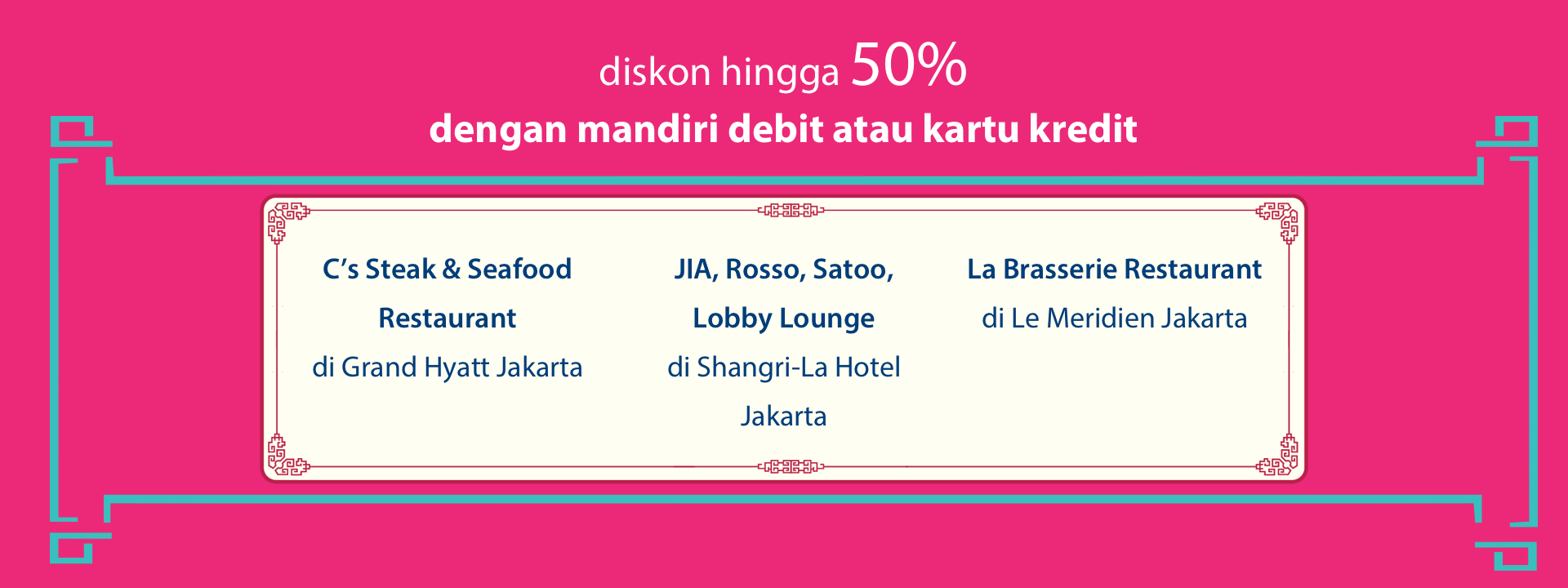 Promo Tahun Baru di Shangri-La Hotel SATOO Program "Promo Tahun Baru Shangri-La Hotel, Jakarta" yaitu program persembahan dari Bank Mandiri dan Shangri-La Hotel, Jakarta memberikan penawaran khusus kepada pemegang Mandiri Kartu Kredit yang melakukantransaksi di Shangri-La Hotel, Jakarta akan mendapatkan penawaran khusus Beli 1 dapat 2 di SATOO dan dapatkan diskon 20% untuk setiap ...