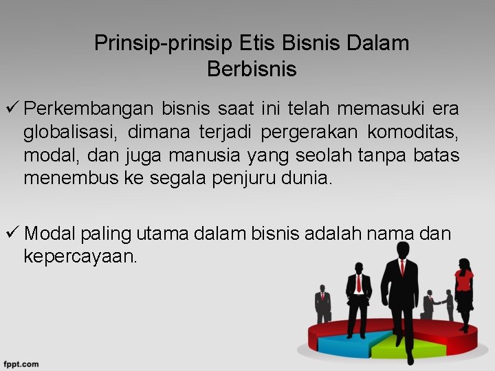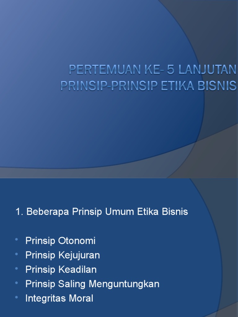Prinsip prinsip etika bisnis. Prinsip Etika Bisnis Perusahaan Ada 5 prinsip yang harus kamu pahami dalam melakukan sebuah kegiatan bisnis. 1. Prinsip Kejujuran Prinsip pertama dan paling mendasar etika bisnis adalah kejujuran sebagai salah satu kunci sukses suatu usaha. Karena tanpa adanya kejujuran maka bisnis tidak dapat bertahan lama. Widyahartono (1996:74) mengatakan prinsip bisnis amoral itu menyatakan "bisnis adalah bisnis dan etika adalah etika, keduanya jangan dicampur-adukkan". Dasar pemikirannya sebagai berikut : Bisnis adalah suatu bentuk persaingan yang mengutamakan dan mendahulukan kepentingan ego-pribadi. Pada dasarnya prinsip-prinsip etika bisnis tidak jauh berbeda dengan prinsip-prinsip yang ada pada kehidupan sehari-hari kita, dan prinsip-prinsip tersebut juga berhubungan erat dengan kehidupan masyarakat pada umumnya di seluruh belahan dunia. Menurut (Sonny Keraf, 1998, dikutip oleh Arijanto, 2011), prinsip-prinsip etika bisnis meliputi: Prinsip otonomi Sikap dan kemampuan manusia untuk ... Beberapa prinsip umum etika bisnis Secara umum, prinsip - prinsip yang berlaku dalam kegiatan bisnis yang baik sesungguhnya tidak bisa dilepaskan dari kehidupan kita sebagai manusia. Demikian pula,prinsip - prinsip etika bisnis yang berlaku di indonesia akan sangat dipengaruhi oleh sistem nilai masyarakat kita.