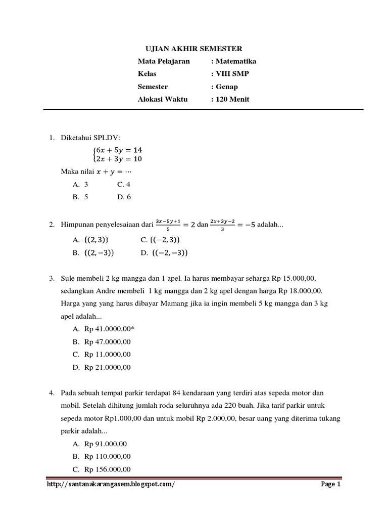 Bank soal matematika kelas 8 semester 2 pdf. Latihan Soal PAS Matematika SMP Kelas 8 Semester 1 2021 K13 PAS (Penilaian Akhir Semester) adalah ujian UAS yang berganti istilah setelah adanya perevisian di kurikulum 2013. Yang mana materinya pun sedikit berbeda dengan 2 kurikulum pertama (KTSP, K13). Jumlah soal PAS Matematika kelas 8 semester 1 (ganjil) ini adalah 30 butir soal. Yang mana untuk link download file pdf bisa klik di bawah ini. Soal Ujian Kelas 3 Semester 2 : Bank Soal Matematika Smp ... Berikut ini adalah kumpulan soal uts kelas 3 semester 2 tahun ajaran 2017/2018 dan file download soal uts pkn, bahasa indonesia, ips, ipa, matematika, . Buku sumber soal sd kelas 3 plus kunci jawaban plus ringkasan materi jual buku super bank soal sd kelas.3 semester 1 dan 2. Top pdf soal semester 2. SOAL PAS MATEMATIKA SMP KELAS 8 KURIKULUM 2013 - Academia.edu try out penilaian akhir semester 1 lembaga bimbingan belajar jari smart tahun ajaran 2018/2019 kelas 8 smp matematika k13 a. 10, 12, 15 a. 28 cm b. 17, 21, 26 b. 25 cm c. 20, 21, 29 c. 15 cm d. 34, 14, 30 d. 8 cm 25. PDF Matematika Kelas 8 Semester 2 Dan Kunci Jawaban PDF dapat ... Download Soal Uts Matematika Kelas 8 Semester 2 Dan Kunci Jawaban PDF (20.00 MB) - SamPDF Download Soal Uts Matematika Kelas 8 Semester 2 Dan Kunci Jawaban PDF secara gratis di SamPDF. Detail Soal Uts Matematika Kelas 8 Semester 2 Dan Kunci Jawaban PDF dapat kamu nikmati dengan cara klik link download dibawah dengan