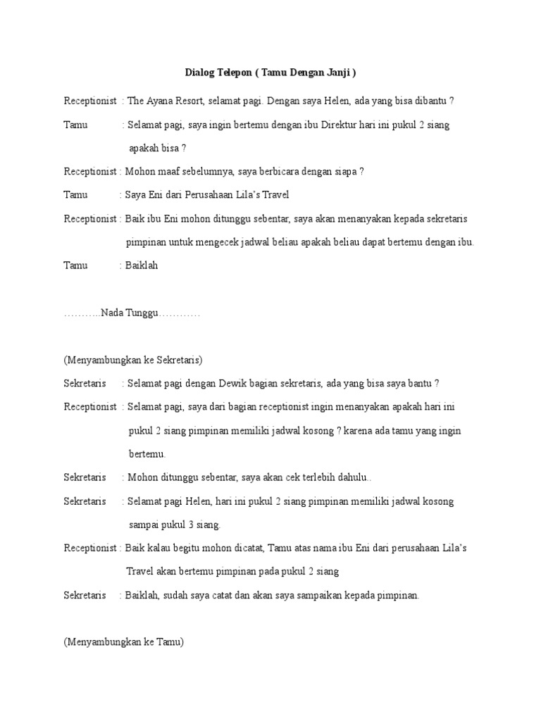 Percakapan 4: Memesan Kamar Hotel Melalui Telepon — Percakapan 1: Membuat Janji Bisnis Melalui Telepon. Situation: Sally is Oliver's new client. She ... Beberapa tips yang bisa kamu lakukan sebelum menawarkan produk kepada calon pembeli adalah sebagai berikut : Percaya Diri dan Jangan Ragu Menunjukkan Keunggulan Produk Memberikan Kesan Pertama yang Baik Jangan Merendahkan Produk Lain Memberikan Perhatian dan Pelayanan Terbaik Menjalin Interaksi Positif dengan Calon Pembeli Untuk Anda yang sedang mencari dan membutuhkan percakapan Sekretaris dalam Telepon berikut ini saya berikan dalam bahasa Indonesia dan bahasa Inggris. Silahkan di baca atau di copy untuk membantu tugas Anda. Contoh percakapan bahasa inggris melalui telepon tentang bisnis. Contoh percakapan bahasa inggris dalam bisnis hai sahabat sbi yang super untuk berbicara tentangi bisnis dengan rekan bisnis kita maka kita harus brbicara sopandengan gaya bahasa formal tentunnya kita bisa membahas bermacam macam hal bisnis yang perlu dibicarakan lebih lanjut.