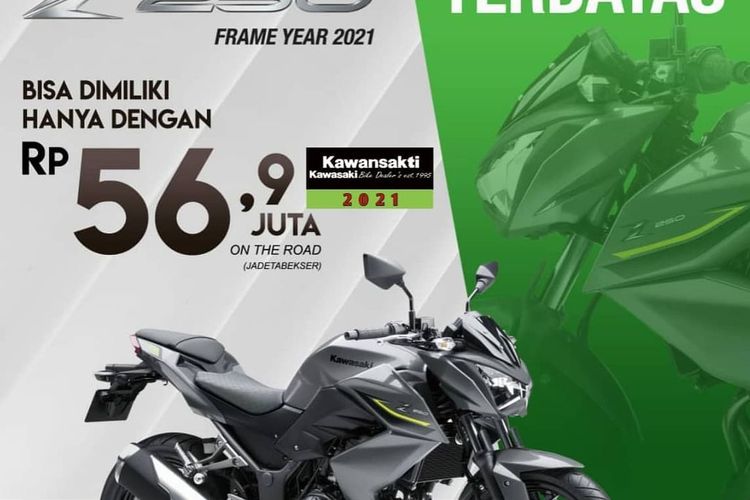 Kredit Kawasaki Z250, Angsuran Sejutaan Untuk Tenor dan ... Harga motor baru Kawasaki Z250 sekitar Rp 56,9 juta, aslinya Rp 62 jutaan. Otomotifnet.com - Kawasaki Z250 memiliki harga Rp 56,9 juta on the road Jakarta, Depok, Tangerang, Bekasi dan Serang (Jadetabekser). Sementara harga untuk wilayah Bogor lebih mahal sedikit, Rp 57,35 juta.