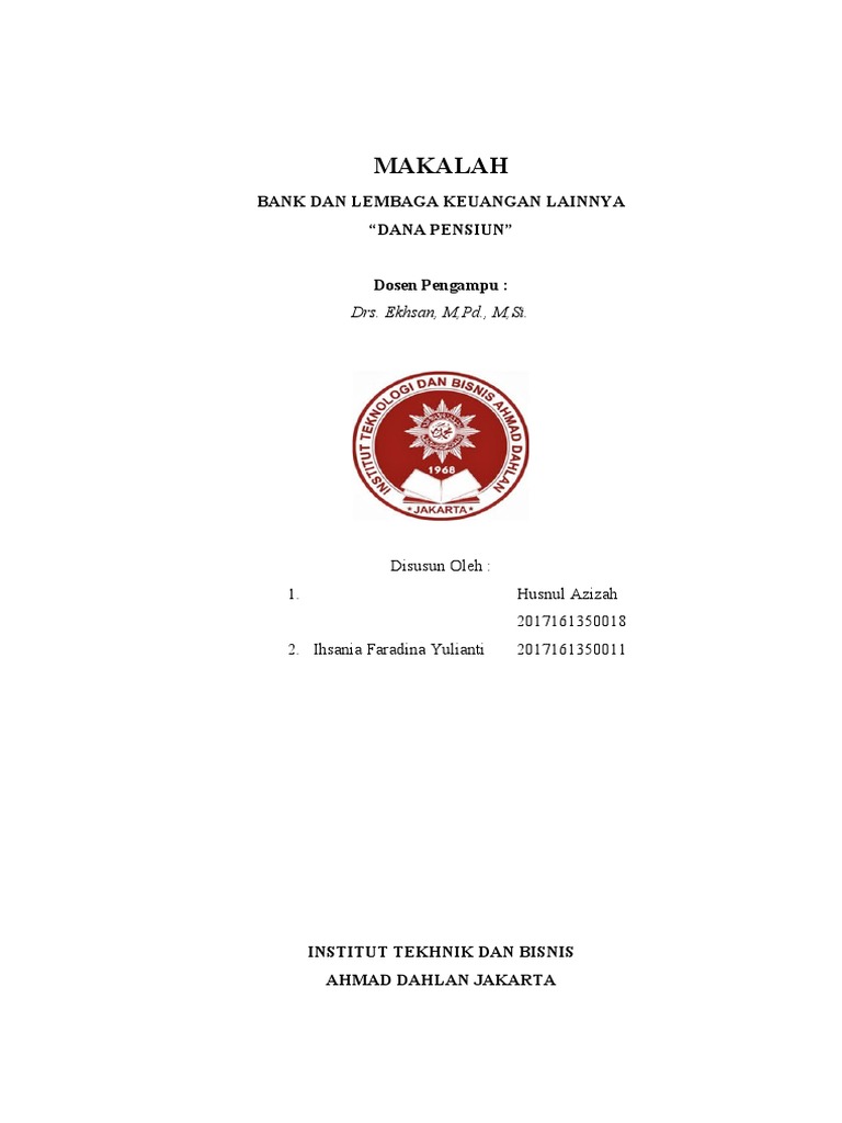 PDF PENDAHULUAN Latar Belakang Masalah - UMS pendiri Dana Pensiun dan juga sesuai dengan ketentuan yang berlaku yaitu Peraturan Menteri Keuangan No.199/PMK.010/2008 yang mengatur tentang Investasi Dana Pensiun Pada tanggal 20 April 1992 lahir Undang-undang Nomor 11 tahun 1992 tentang Dana Pensiun sebagai landasan hukum dan operasional bagi Dana Pensiun. MAKALAH DANA ASURANSI DAN PEGADAIAN ~ MyPilih H. Pengaturan dana pensiun di Indonesia Dalam penjelasan UU No.11 Tahun 1992 tentang Dana Pensiun disebutkan bahwa dalam rangka upaya memelihara kesinambungan, penghasilan pada hari tua perlu mendapat perhatian dan penanganan yang lebih berdaya gun dan berhasil guna. makalah dana pensiun - MAKALAH KESEHATAN KEPERAWATAN & UMUM Dana pensiun merupakan bentuk investasi jangka panjang yang hasilnya dapat dinikmati setelah pegawai atau karyawan yang bersangkutan memasuki masa pensiun. Ada empat faktor yang menyebabkan seorang pegawai atau karyawan memasuki masa pensiun, yaitu karena kematian, keluar dari pekerjaan, cacat, dan pensiun normal. Makalah Dana Pensiun format Microsoft Word Edisi Terbaru Makalah Dana Pensiun format Microsoft Word Terbaru Doc Pdf. Pembagian makalah yang berjudul "Dana Pensiun" bisa digunakan sebagai contoh dalam pembuatan karya tulis ilmiah ini. Materi yang digunakan dari makalah ini berasal dari mata pelajaran terkait silahkan menyesuaikannya sendiri berdasarkan kebutuhan tugas.