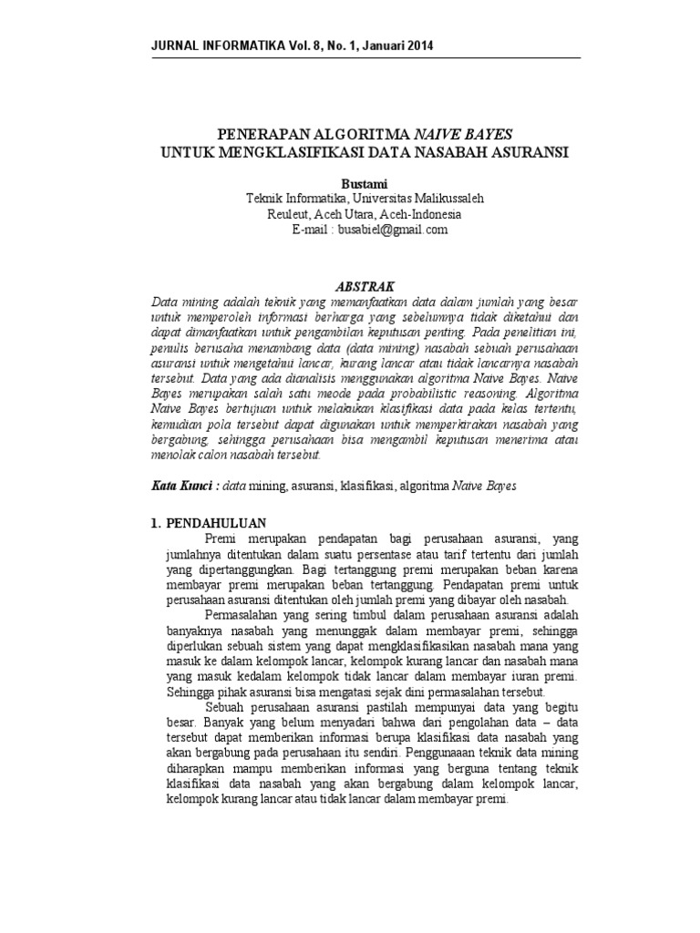Bustami, B. (2013). Penerapan Algoritma Naïve Bayes Untuk Mengklasifikasi Data Nasabah Asuransi. TECHSI-Jurnal Teknik Informatika, 5(2), 127-146. Gorunescu, F. (2011). Data Mining: Concepts, Models and Techniques (Vol. 12). Springer Science & Business Media. Jananto, A. (2013). Algoritma Naive Bayes untuk Mencari Perkiraan Waktu Studi Mahasiswa. Mengklasifikasi Data Penerapan Algoritma Naive Bayes Untuk Mengklasifikasi Data Getting the books penerapan algoritma naive bayes untuk mengklasifikasi data now is not type of inspiring means. You could not unaccompanied going as soon as book hoard or library or borrowing from your connections to right of entry them. This is an definitely easy ... PENERAPAN ALGORITMA NAIVE BAYES UNTUK MENGKLASIFIKASI DATA NASABAH ASURANSI Oleh : Bustami Dosen Teknik Informatika Universitas Malikussaleh ABSTRAK Data mining adalah teknik yang memanfaatkan data dalam jumlah yang besar untuk memperoleh informasi berharga yang sebelumnya tidak diketahui dan dapat dimanfaatkan untuk pengambilan keputusan penting. Naive Bayes merupakan salah satu meode pada probabilistic reasoning. Algoritma Naive Bayes bertujuan untuk melakukan klasifikasi data pada kelas tertentu, kemudian pola tersebut dapat digunakan untuk memperkirakan nasabah yang bergabung, sehingga Perusahaan bisa mengambil keputusan menerima atau menolak calon nasabah tersebut. Full text