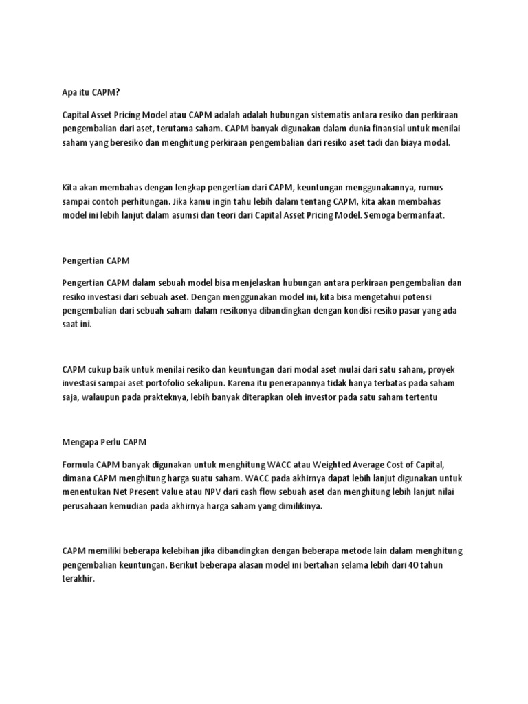 PENGHITUNGAN WACC CAPM Capital Asset Pricing Model Model CAPM (Capital Asset Pricing Model) • Model yang digunakan untuk menentukan tingkat pengembalian (required return) dari suatu aset. CAPM juga sering digunakan untuk menentukan nilai cost of equity. • Rumus CAPM: Cost of Equity = Rf + β*(Rm-Rf) dimana: Rf = Risk free rate β (beta) = Systematic risk Rm = Market return Cara Menghitung Beta Saham CAPM - SahamOnline.ID Kalo cara paling mudahnya, kita tinggal gunakan fungsi =SLOPE (data_y,data_x) untuk mengetahui nilai betanya; Data_y adalah return dari asset yang kita pilih; dalam contoh soal kali ini adalah return dari saham XL Axiata. Data_x adalah market return yaitu return IHSG. Setelah itu kita bisa dapatkan nilai beta nya yaitu β = 0.781277281. Setelah ... Contoh Perhitungan Capm - Contoh Soal Dan Jawaban Capm Dan ... Akan dibentuk berdasarkan perhitungan beta capm. Pada dasarnya, capm adalah suatu teori yang mampu menghitung bagaimana suatu saham atau aset berharga yang memiliki risiko lain mampu memberikan . The capm model illustrates the relationship. Akan dibentuk berdasarkan perhitungan beta capm. The capm model illustrates the relationship. CAPM Adalah: Pengertian, Dan Manfaat CAPM dalam Investasi ... Karena metode CAPM adalah suatu pendekatan yang bisa memperkirakan hasil, maka di dalamnya dikenal istilah beta. Beta adalah suatu cara mengukur tingkat keuntungan dari aset berharga atas return market. Jika nilai beta adalah 1, setiap 1% perubahan return pasar maka nilai return sahamnya akan sama dengan return saham yang ada.