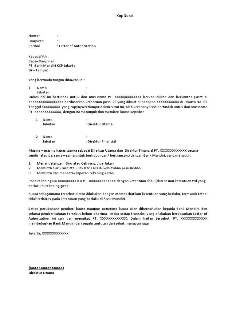 Letter of authorization bank mandiri. GCG Charter Detail. Mandiri Whistleblowing System - Letter to CEO. In order to safeguard and enhance Bank Mandiri’s reputation, risk control systems and facilities are needed through active participation of Bank Mandiri employees and other stakeholders to submit reports regarding acts or indications of fraud, non-fraud and/or other violations ... The first party in a bank authorization is a person or group that gives authority for their accounts to be accessed by a third party. The first party sends a letter to the second party requesting that the third party accesses their accounts. One should explain in the authorization letter, the rights that a third party may exercise. Letter of Authorization (for USD) for the account of Bank Mandiri, No amount *) Beri tanda silang pada butir yang dipilih/Cross the appropriate one Cat: Cover tersebut harus berada pada penguasaan Bank sebelum Penerbitan Guarantee Note: The above stated Cover have to be in the Bank’s possession before the issuance of Guarantee