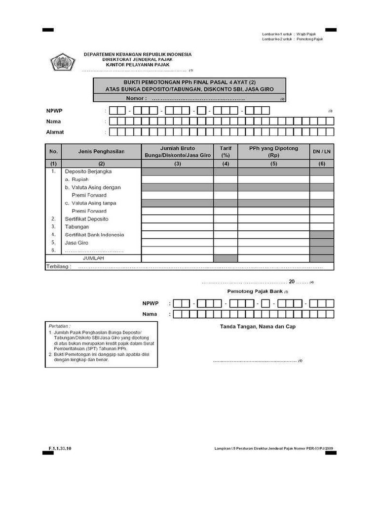 Pajak atas Bunga Deposito, Tabungan, dan Diskonto SBI May 02, 2017 · Peraturan yang terkait dengan pelaksanaan pemotongan PPh Pasal 4 ayat 2 atas penghasilan berupa bunga deposito/bunga tabungan/diskonto SBI adalah: Pasal 4 ayat 2 Undang-Undang Pajak Penghasilan. Peraturan Pemerintah Nomor 123 Tahun 2015. Peraturan Menteri Keuangan Nomor 26/PMK.010/2016. Sesuai dengan dasar hukum di atas, deposito yang dimaksud ... Pajak Penghasilan Atas Bunga Deposito Dan Tabungan Serta ... Disamping wajib memotong Pajak Penghasilan atas bunga dan diskonto yang dibayarkan atau terutang sebagaimana dimaksud dalam Pasal 1 ayat (1), bank-bank tersebut juga wajib memotong Pajak Penghasilan atas bunga dari deposito dan tabungan yang ditempatkan di luar negeri melalui bank yang didirikan di Indonesia atau cabang bank luar negeri yang ... Pajak atas bunga bank - Ortax Feb 05, 2010 · Pajak penghasilan tidak boleh jadi biaya. Mungkin maksudnya biaya adm bank karena punya simpanan dibank ya rekan ansori… Biaya adm bank tersebut tidak boleh jadi biaya fiskal. sebab, penghasilannya (pendapatan bunga) dikenai pajak bersifat final. Salam