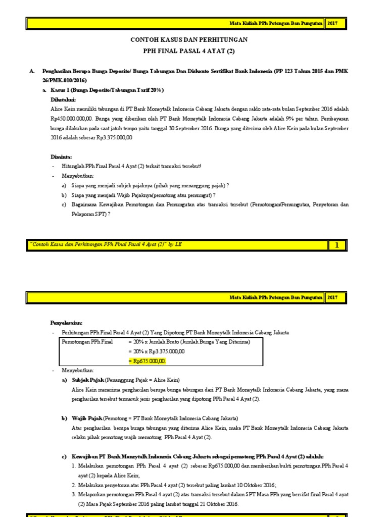 Pajak atas Bunga Deposito, Tabungan, dan Diskonto SBI May 02, 2017 · Peraturan yang terkait dengan pelaksanaan pemotongan PPh Pasal 4 ayat 2 atas penghasilan berupa bunga deposito/bunga tabungan/diskonto SBI adalah: Pasal 4 ayat 2 Undang-Undang Pajak Penghasilan. Peraturan Pemerintah Nomor 123 Tahun 2015. Peraturan Menteri Keuangan Nomor 26/PMK.010/2016. Sesuai dengan dasar hukum di atas, deposito yang dimaksud ...