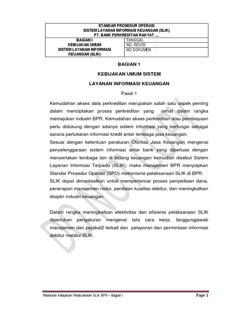 blog.investree.id › bisnis › berikut-2-contoh-sopBerikut 2 Contoh SOP Perusahaan Serta Cara Membuatnya ... Sep 03, 2021 · Di dalam SOP perusahaan atau organisasi kita akan bisa melihat bagaimana prosedur kegiatan operasional dilakukan oleh masing-masing bagian atau divisi. SOP atau Standard Operating Procedure merupakan serangkaian dokumen berisi instruksi tertulis yang mengatur bagaimana proses dan prosedur pelaksanaan operasional dari organisasi atau perusahaan. Baca lebih lanjut tentang tujuan dan contoh SOP ... Sop Operasional - Kumpulan Regulasi - Bpr Prima Nadi SOP OPERASIONAL - KUMPULAN REGULASI. OJK menerbitkan PERATURAN OJK nomor 11 /POJK.03/2020 Tentang STIMULUS PEREKONOMIAN NASIONAL SEBAGAI KEBIJAKAN COUNTERCYCLICAL DAMPAK PENYEBARAN CORONAVIRUS DISEASE 2019 _update 20-03-2020. (PPT) PEDOMAN AKUNTANSI BPR ETAP | Cynthia Devi - Academia.edu • Jumlah kredit pada pihak terkait • Kedudukan BPR dalam pembiayaan bersama dan porsi yang dibiayai BPR. • Jumlah kredit yang dijamin dan besar resikonya • Jumlah kredit channeling dan kredit exekuting • Jumlah kredit yang direstrukturisasi • Klasifikasi kredit menurut jangka waktu, kualitas dan tingkat suku bunga rata-rata ... (DOC) Anlisis efektivitas SOP dan Job Description pada BPR ... Dalam lampiran VII penulis membuat contoh SOP yang baik untuk prosedur pengajuan dan administrasi kredit bagian BPR Arto Moro dan perbaikan job description customer service di lampiran VIII. 2.2.3.3. Penjelasan Prosedur dan Kendala Secara keseluruhan tanggung jawab dari setiap jabatan yang ada di BPR Arto Moro sudah jelas.